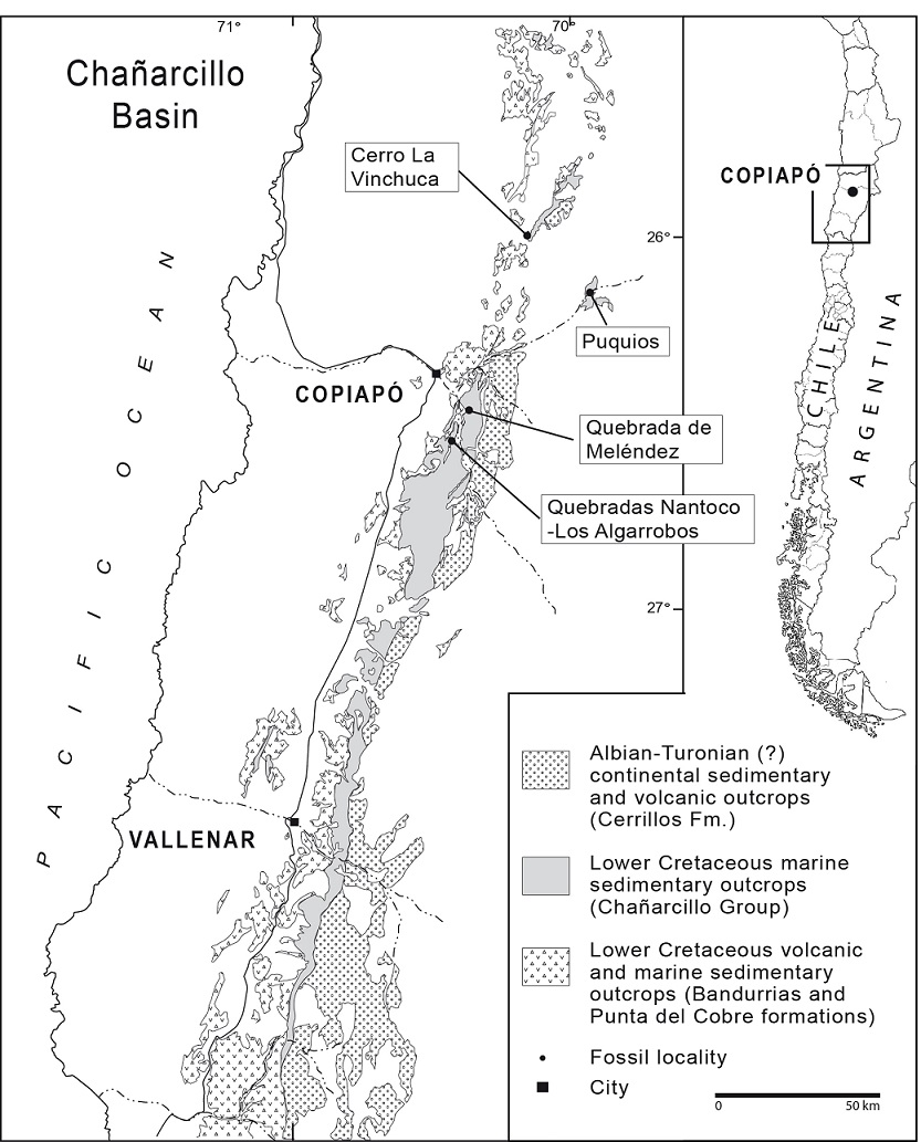 FIG. 1. Geographic distribution of the olcostephanidfaunas of the Chañarcillo Basin (simplified after SERNAGEOMIN, 2002). |