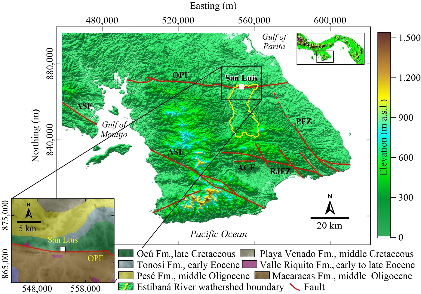 The San Luis area is located in the northern part of the Estibaná River watershed, on the Azuero Peninsula of Central Panama. The area is dissected by the trace of the Ocú-Parita fault, which crosses the entire peninsula in an east-west direction (Fig. 1).