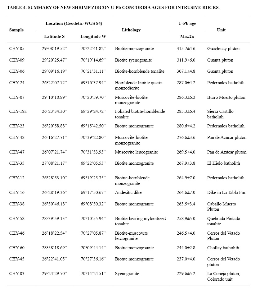 The zircon U-Pb ages for intrusive rocks exposed along the High Andes and Domeyko Cordillera range from 328.1±2.8 to 205.9±0.5 Ma (Table 2), overlapping with the corresponding interval of U-Pb dates of volcanic rocks (ca. 310 to 194 Ma; Table 1). The intrusions include coarse-grained granitoids and porphyritic felsic plutons; the late are closely related to the volcanic rocks. Foliated plutons (ductile deformation) show U-Pb ages in the range 328 to 288 Ma (Table 2).
