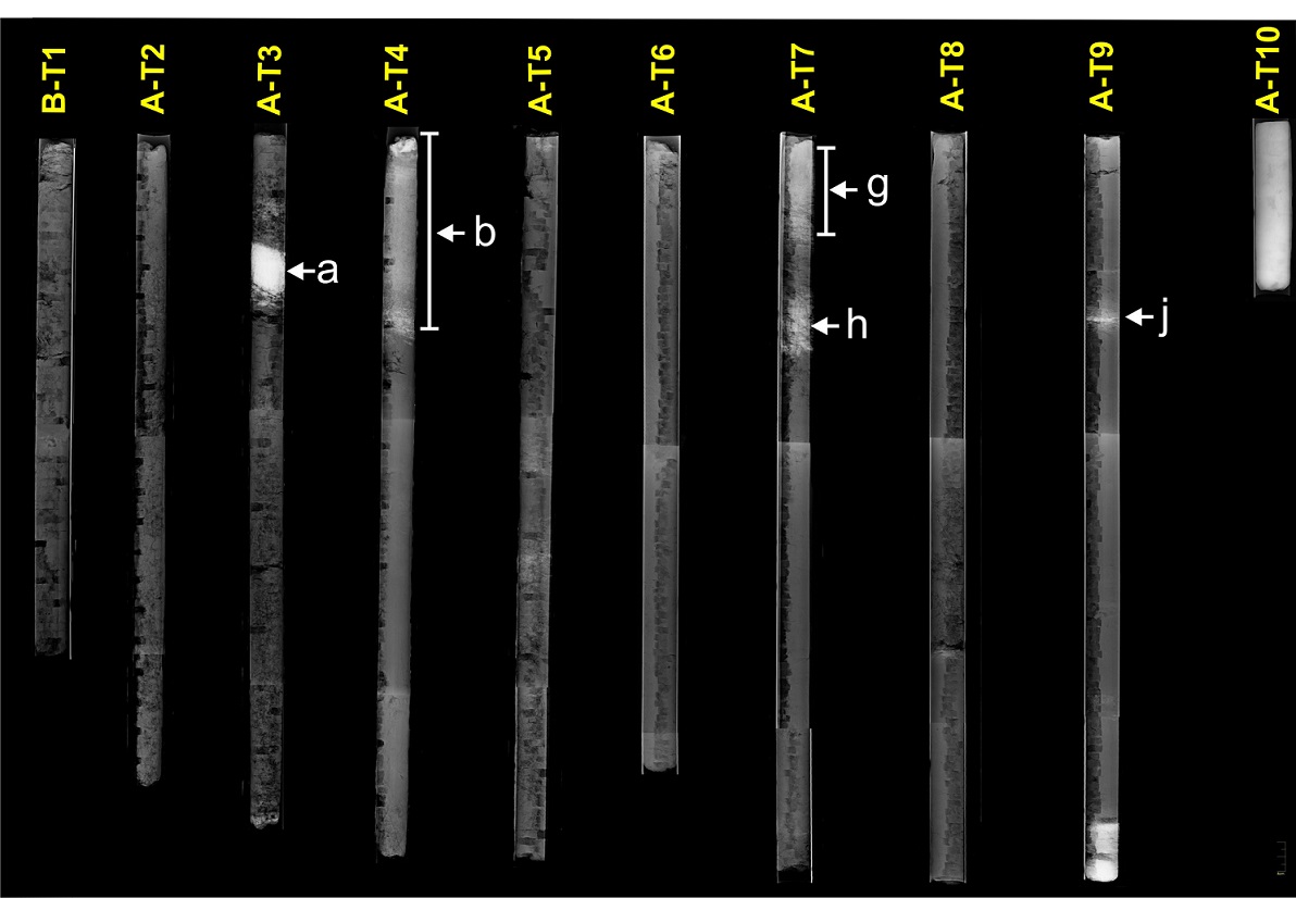 Fig. 3. X-ray image of Lago Shaman core (de Porras et al., 2012). Bright white layers are either sand or tephra and darker areas are organic rich sediments. |
