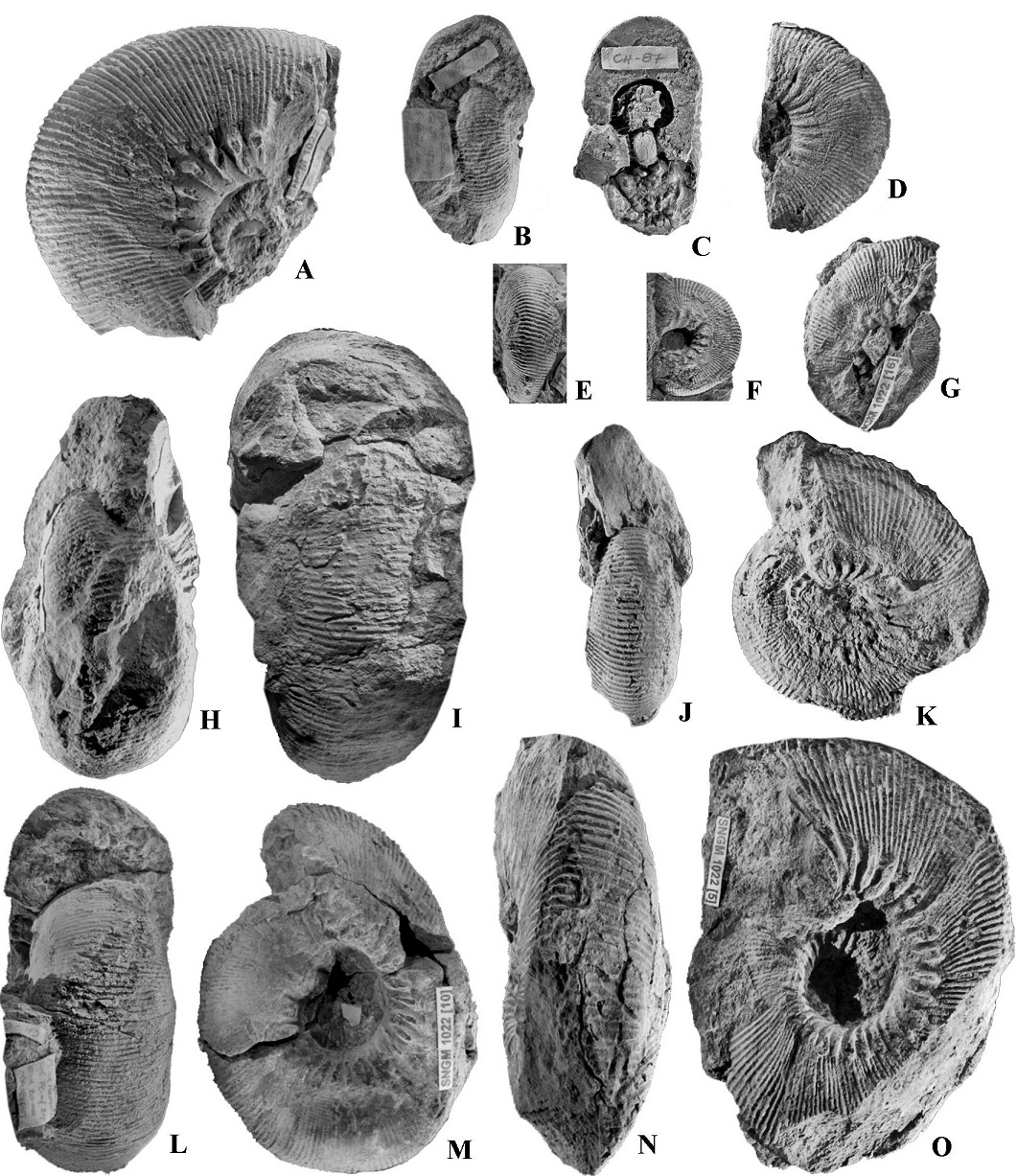 Occurrence: Olcostephanus (Olcostephanus) is widely distributed in the Mediterran-Caucasian and Indo-Pacific subrealms of the Tethyan Realm and adjacent areas of the Boreal Realm sensu Westermann (2000). In the western Tethys, the subgenus is known to range from the highest Upper Berriasian (F. boissieri Zone, T. otopeta Subzone) to the high Lower Hauterivian, L. nodosoplicatum Zone, O. (O.) variegatus biohorizon (Bulot, 1990a; Bulot, 1992; Bulot et al., 1993; Bulot and Thieuloy, 1995). In South America, Olcostephanus (Olcostephanus) is known from Colombia, Perú, Chile and Argentina. The oldest occurrence was reported from the early Valanginian of the Neuquén Basin (Aguirre-Urreta and Rawson, 1999) and possibly Colombia (Etayo Serna, written communication 1999). ‘Middle’ Valanginian Olcostephanus of the atherstoni group occur in all countries listed above except Perú (Riedel, 1938; Haas, 1960; Riccardi et al., 1971; this paper). Late early Hauterivian Olcostephanus of the sayni-variegatus (Paquier, 1900) plexus are known from all those countries except Chile (Riedel, 1938; Haas, 1960; Robert et al., 1998; Aguirre-Urreta and Rawson, 2001).