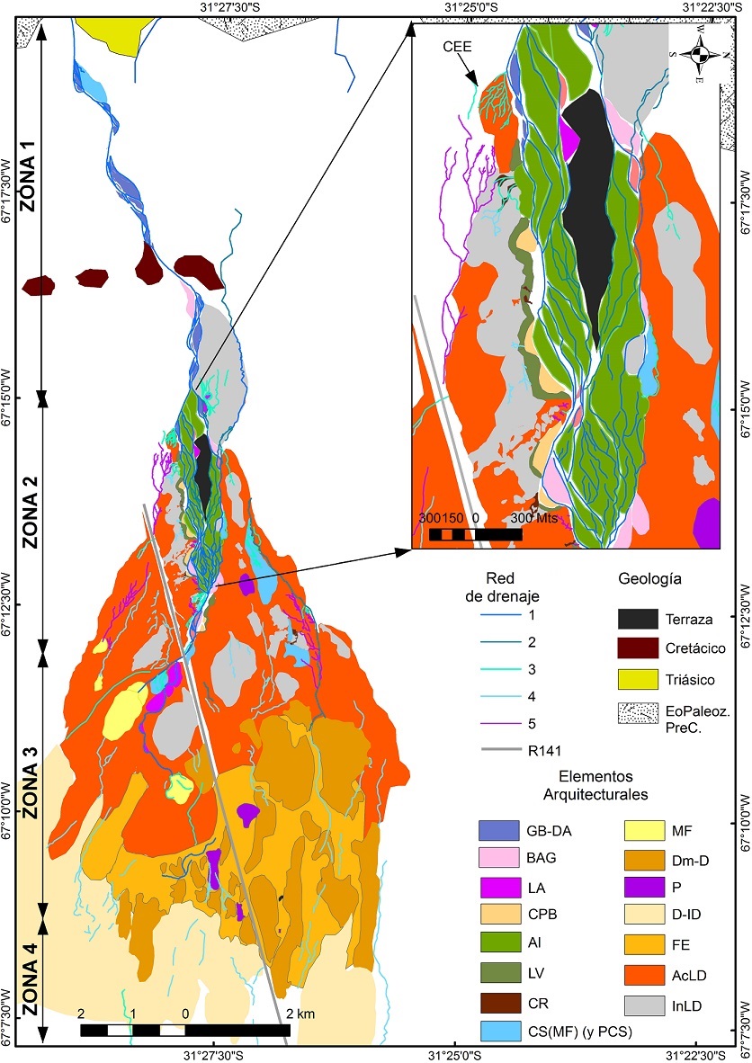 De acuerdo con el procesamiento de las imágenes satelitales y al mapeo sedimentológico y geomorfológico de detalle realizado, se han distinguido cuatro zonas, las que presentan la asociación de diferentes elementos arquitecturales (Tabla 3).
