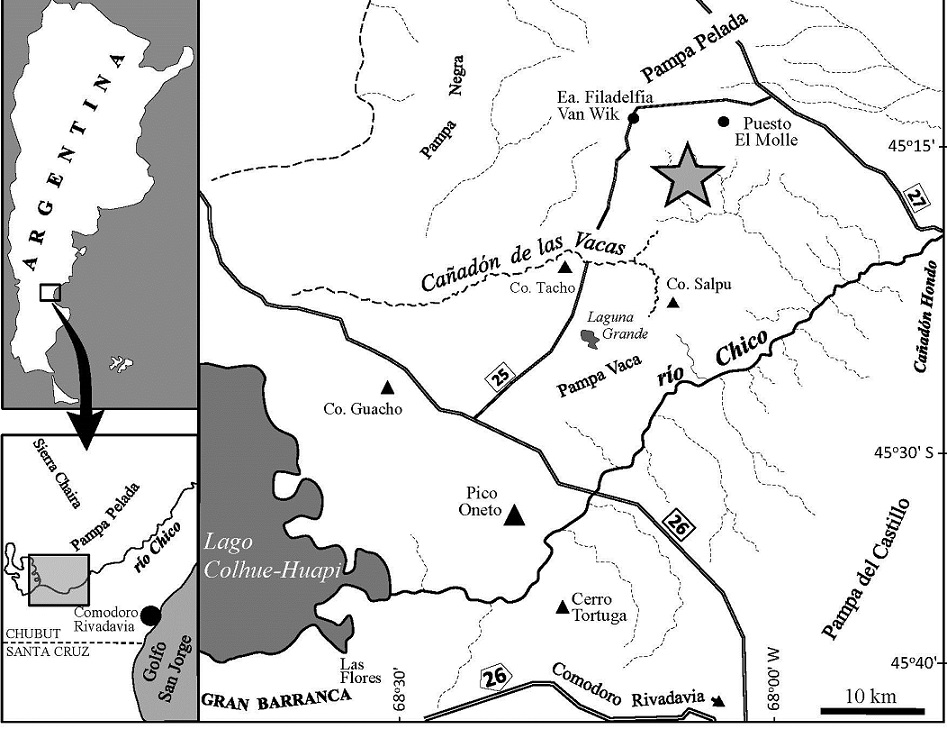 Fig. 1. Location of Cañadón Vaca area (star) in Chubut province, Argentina. Other localities mentioned in the text are included. |
