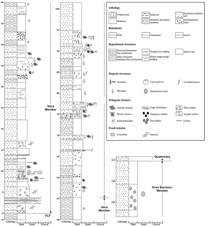Dissimilarities between ‘Barrancan’ and ‘Vacan’ faunal associations, and the affinity between the last and the ‘Riochican’ preserved in the upper Río Chico Group, could indicate a hiatus separating both ‘Casamayoran’ Subages (Cifelli, 1985). According to Goin et al. (2012), the temporal value of this hiatus would be 2 m.a. (44-42 Ma). Notwithstanding, sedimentologic observations presented herein do not support such interpretations. General stacking pattern and similar facies, repeated arrangement of the same pedotypes and absence of bounding surfaces, point to a transitional contact between CVM and GBM and comparable depositional landscapes. In addition, any paleosol of the entire succession is sufficiently developed to involve a prolonged lapse; despite of time of pedogenesis is always greater than time of sedimentation (Retallack, 2001a). Compared to similar examples from the type locality, where properties and chronologic significance of discontinuity surfaces are known (Bellosi, 2010a, b), the boundary between CVM and GBM at Cañadón Vaca area imply a short time. Accordingly, it is suggested that if it exists, there would be a non significant hiatus between ‘Vacan’ and ‘Barrancan’ associations.