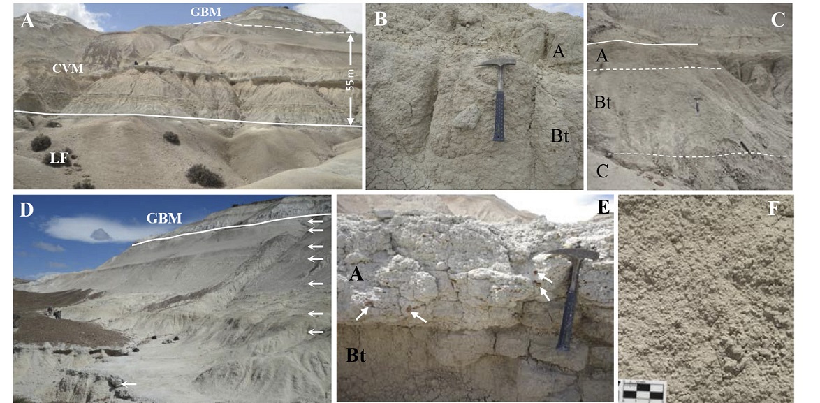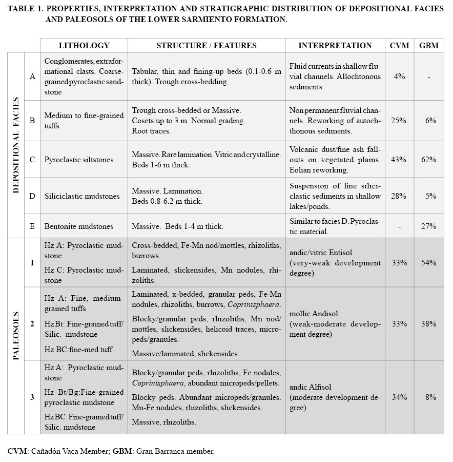 Table 1 summarizes the characteristics, interpretation and stratigraphic distribution of depositional facies and paleosols of the Sarmiento Formation (Fig. 4). They are massive or laminated pyroclastic and siliciclastic mudstones, cross-bedded medium and fine-grained tuffs bearing fossil vertebrates, bentonite mudstones, conglomerates with extraformational clasts (volcanic, metamorphic rocks), coarse-grained pyroclastic sandstones and three pedotypes. In the CVM siliciclastic mudstones and tuffs are more abundant, while conglomerates and coarse-grained sandstones are exclusive and paleosols are less frequent (45% of beds) (Fig. 4d). In the GBM pyroclastic mudstones are more abundant and bentonites are exclusive. Paleosols are numerous (75% of beds) and more strongly developed (Fig. 4b).