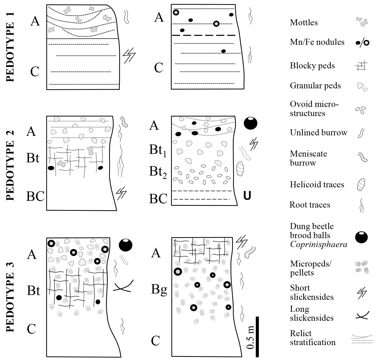 All pedotypes share properties generated in analogous conditions, suggesting that differences are mainly due to time of soil development or intensity of similar soil forming processes. The last were clay lessivage or argilluviation, gleization (formation of Fe-Mn nodules and mottles) and macro or microbioturbation (sediment reworking by soil invertebrates). Stratigraphic distribution of pedotypes displays a cyclic arrangement, without interruptions or discontinuities (Fig. 7a). Cycles include three to five units, from the strongest (pedotype 3) to the weakest developed (pedotype 1), reflecting relative changes in landscape persistence or stability. In both members, characteristics and extension of these cycles are similar.