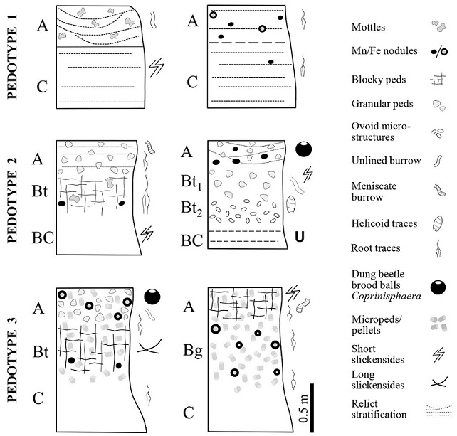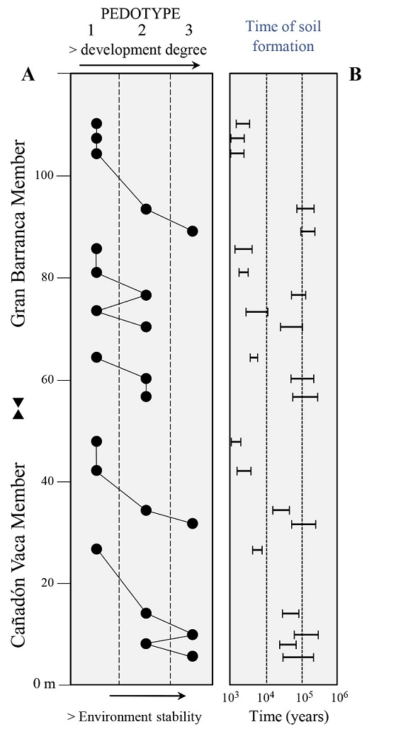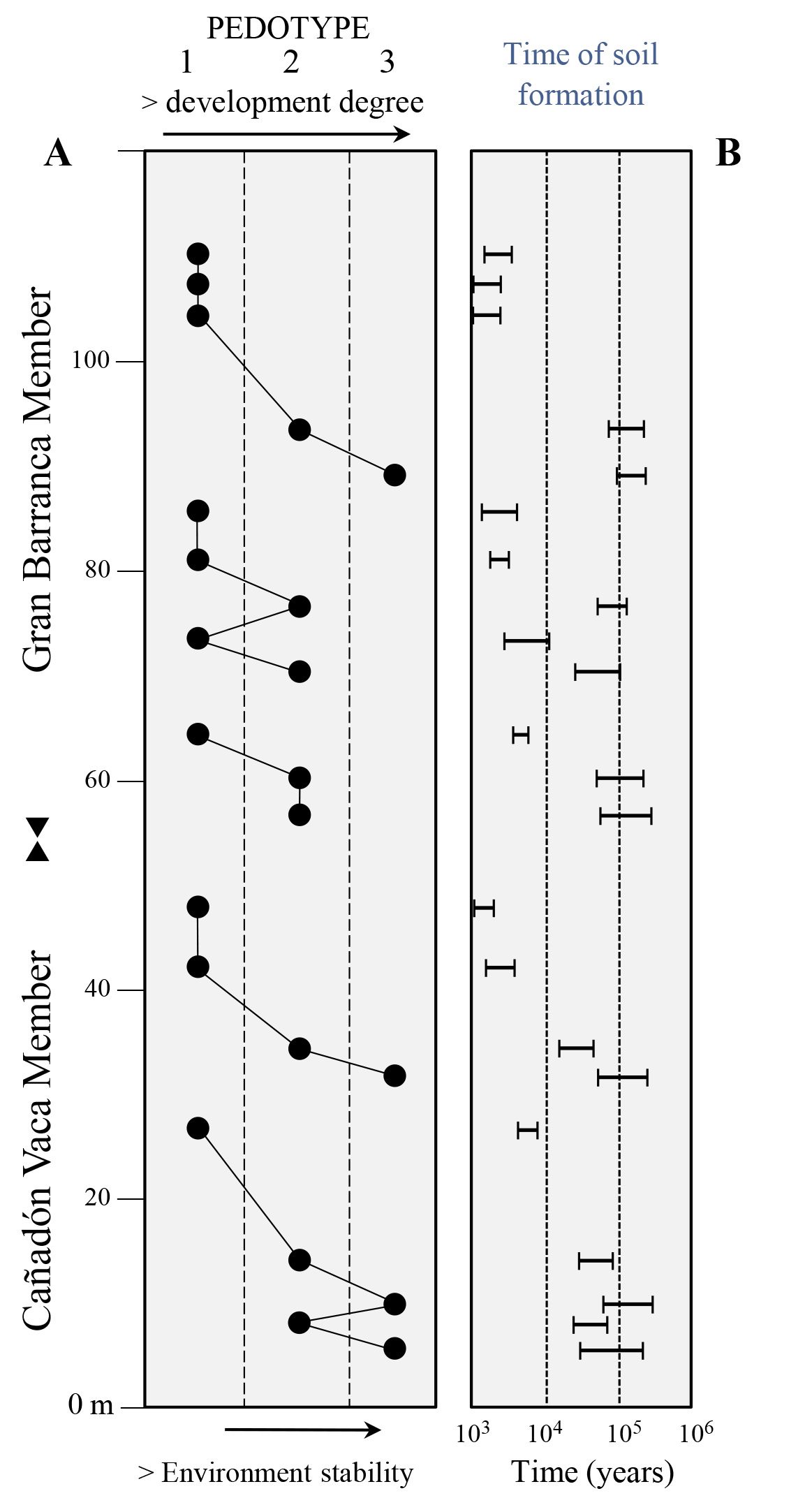 Pedotype 3 gathers paleosols showing the strongest development degree. It represents moderately developed soils according to well-defined horizons, surface horizons with complex ped structure, subsurface argillic horizons, widespread microbioturbation and inexistence of depositional structures. Such attributes are suitable for andic Alfisols, probably originated in seasonal-subhumid and warm-temperate conditions. The stability of the environments where pedotype 3 developed is estimated in 90-350 ky (Fig. 7b). The abundant micropeds or granules (pellets), as a notable component of soil groundmass, reveal a significant invertebrate soil fauna and organic matter availability. This pedotype records more stable settings than previous ones, probably formed late successional ecosystems with herbs and trees.