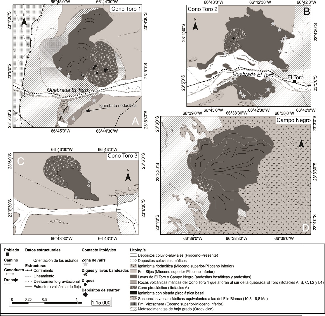 Los conos de escoria han sido denominados Cono Toro 1, 2 y 3, ubicados a ~3 km uno del otro en dirección W y SW del poblado El Toro (23º05’S-66º42’W). El cono restante se llama Campo Negro y se encuentra ~6 km al NE de El Toro (Fig. 2). Los dos primeros edificios están emplazados en una zona que parece ser la intersección de estructuras submeridianas con otras de orientación casi E-W, como la quebrada El Toro (Fig. 2). Por otro, lado el centro eruptivo Campo Negro se emplaza directamente sobre un bloque de basamento ordovícico, con un aparente control de lineamientos de rumbo NW-SE y NE-SW. Las dimensiones de los conos varían en los distintos centros eruptivos estudiados, entre 600 m (Cono Toro 1) y 150 m de diámetro (Campo Negro), y 110 m (Cono Toro 1) a 20 m (Campo Negro) de altura. Estas dimensiones reflejan un grado de erosión relativamente avanzado para las estructuras volcánicas estudiadas, las que, sin embargo, preservan en su mayoría rasgos suficientes para hacer una adecuada caracterización volcanológica.