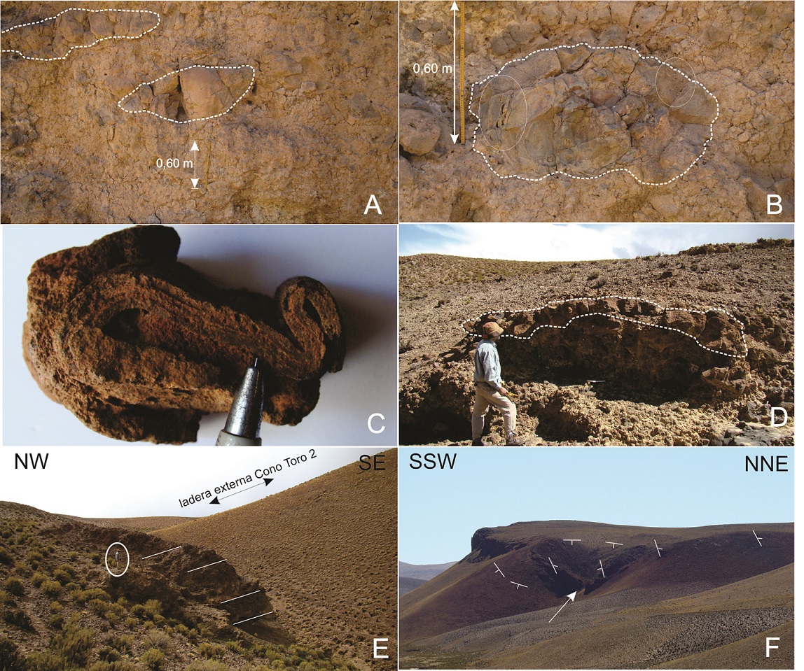 Entre las bombas existen dos morfologías diferentes. Las que más abundan tienen aspecto fluidal o fusiforme, con tamaños entre 10 y 180 cm (Fig. 6A); presentan delgados (1-2 cm) bordes vítreos con estructuras en corteza de pan por enfriamiento brusco de fragmentos incandescentes, desarrollo de estrías y canales sobre la superficie y un amplio núcleo interno vesiculado. Exhiben un fuerte plegamiento dúctil interno y plegamientos exteriores producidos por deformación contra el terreno al momento de la caída, característica que es compartida por fragmentos centimétricos a decimétricos que adoptan formas de cintas (Fig. 6C). El tamaño de estas bombas disminuye notablemente al aumentar la distancia respecto a la cima o eje central inferido de los conos. El otro tipo de bombas, frecuentes solo en el Cono Toro 2 y menos abundantes en el Cono Toro 1, son más densas, de formas elipsoidales o globosas y tamaño de hasta 80 cm de diámetro, diaclasamiento prismático, pequeños núcleos vesiculados y gruesos bordes densos (Fig. 6B). Ambos tipos de bombas poseen microfenocristales de olivino y ortopiroxeno o bien de olivino, ortopiroxeno, clinopiroxeno y hornblenda y son químicamente indistinguibles.