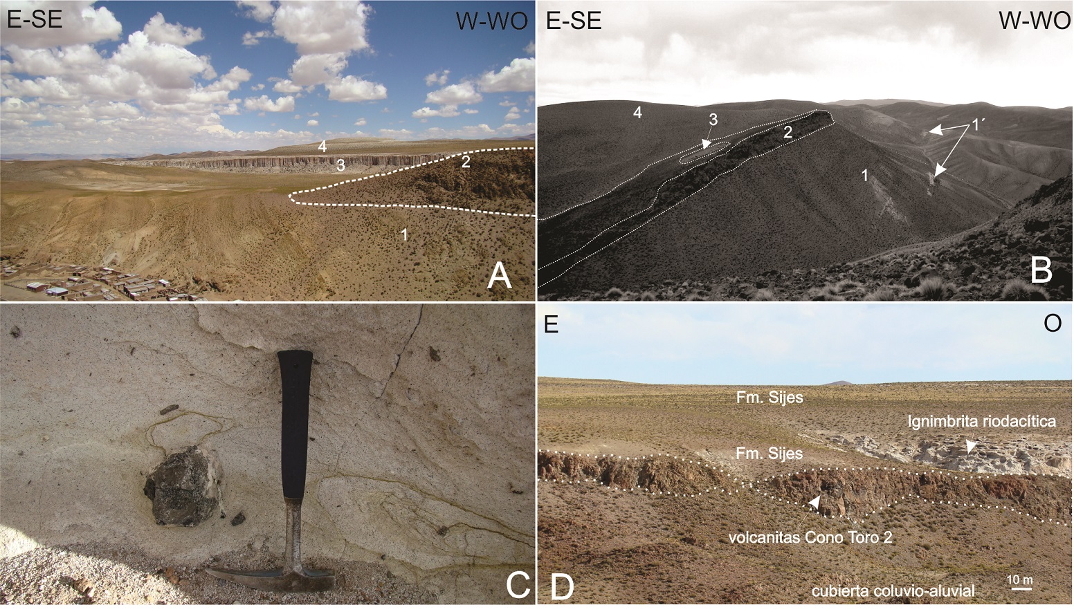 Fig. 4. A. Vista del extremo SE del centro eruptivo Cono Toro 2 (sur de la quebrada El Toro, ver Figura 3B). Metasedimentitas ordovícicas (1) cubiertas por rocas volcánicas máficas (2) en discordancia angular. Al sur se observa una ignimbrita riodacítica (3) que forma parte del conjunto identificado como Formación Sijes (4); B. Afloramientos del centro eruptivo Cono Toro 1 al sur de la quebrada El Toro. De base a techo se observan: Secuencia volcanosedimentaria del Filo Blanco (1) e ignimbrita intercalada (1´); lavas y rocas piroclásticas máficas (2) e ignimbrita riodacítica (3) de la base de la Formación Sijes (4). La columna está inclinada ~7° al E producto de un corrimiento cuya traza se ubica al oeste (derecha de la fotografía); C. Fragmento lítico de composición andesítico basáltica en la base de la ignimbrita riodacítica intercalada en Formación Sijes, inmediatamente al SE del Cono Toro 1; D. Volcanitas máficas del Cono Toro 2 (sector SW) cubiertas por la Formación Sijes e ignimbrita riodacítica basal. |