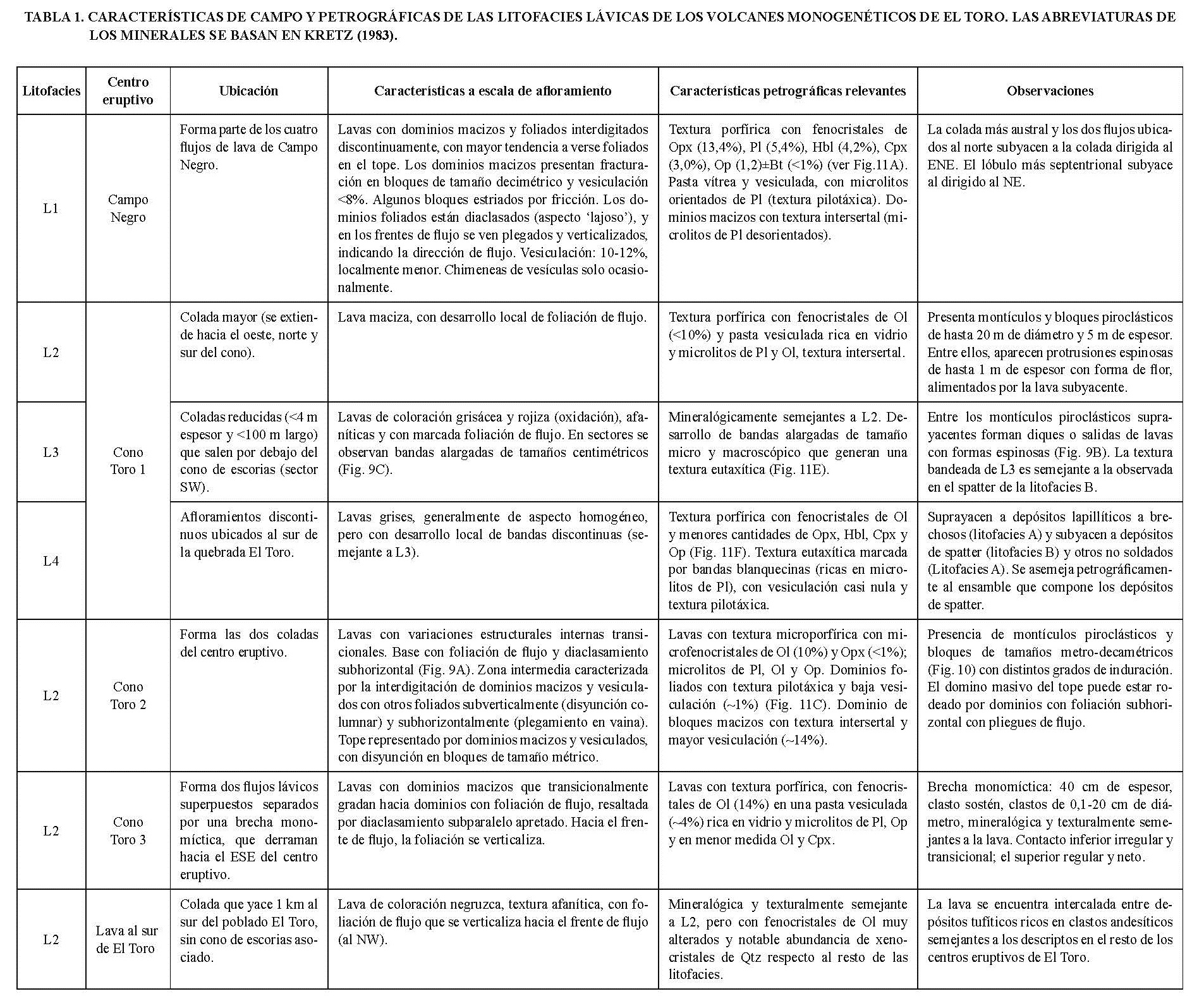 Todos los centros eruptivos de El Toro han generado campos de lava, que en función de sus aspectos composicionales, textura, patrón de flujo y estructuras de enfriamiento, pueden ser asignadas a diferentes litofacies, cuyas características se describen en detalle en la tabla 1. Como es común en centros monogenéticos, las coladas abarcan una superficie mucho mayor que los depósitos piroclásticos. Utilizando un Sistema de Información Geográfica se calcularon áreas totales de 3,87 km2 y 0,75 km2, respectivamente, (Fig. 2). En Campo Negro se mapearon cuatro coladas distintas, mientras que en el Cono Toro 1 hay al menos dos flujos lávicos principales y otros de dimensiones menores. En el Cono Toro 2 se reconocieron al menos dos coladas superpuestas, lo mismo que en el Cono Toro 3. Por último, ~1 km al sur del poblado El Toro (23º05’36”S-66º41’58”W, Fig. 2), se mapeó un flujo de lava de composición andesítica que aparentemente no está asociado a ningún cono de escorias.