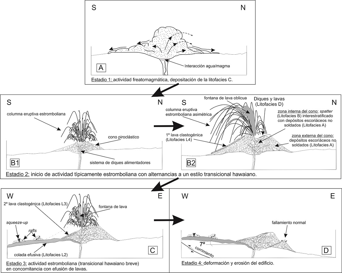 Las tobas y lapillitas basales e intermedias (horizontes a-c) de la litofacies C (Fig. 9), tienen características litológicas (presencia de fragmentos juveniles y accidentales del sustrato; bombas tipo coliflor, palagonitización de los vitroclastos), así como estructuras tractivas sin-depositacionales que, en combinación con los discretos espesores de las capas, sus espesores lateralmente variables y sus acotadas dimensiones, permiten interpretarlas como depósitos de oleadas basales o ‘base surges’ generados a partir de erupciones freatomagmáticas (Sohn, 1996; Valentine y Fisher, 2000; Nèmeth y Martin, 2007). El resto del depósito representaría material de caída proveniente de la misma columna eruptiva que generó las oleadas, o de una columna efímera desarrollada inmediatamente a continuación de las erupciones freatomagmáticas, que grada finalmente a un comportamiento de tipo estromboliano típico.
