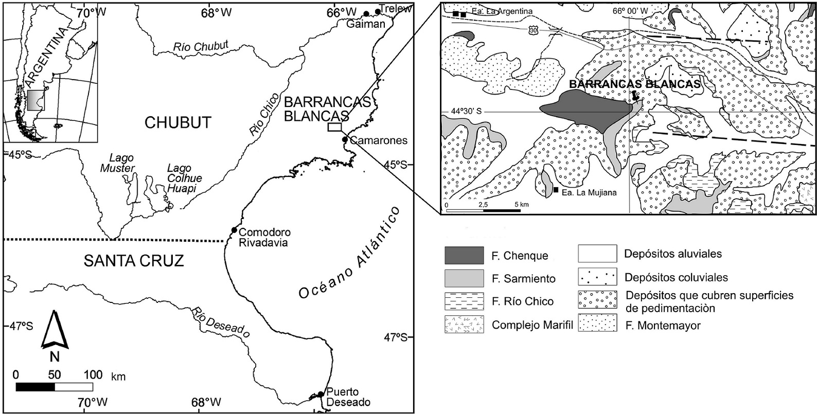 La localidad Barrancas Blancas, ubicada en el límite occidental de la Hoja Geológica de Camarones (Lema et al., 2001), se localiza en la Estancia La Argentina, a unos 30 km de la localidad costera de Camarones, en el Departamento Florentino Ameghino en el sureste de la provincia de Chubut (Fig. 1). El afloramiento en dicha localidad está integrado, desde la base al techo, por sedimentitas continentales y marinas correspondientes a la Formación Sarmiento, las primeras, y a la Formación Chenque (Sciutto et al., 2000; Patagoniano sensu Feruglio, 1950), las segundas. Esta última se ha denominado también Formación Camarones (Camacho, 1979). Coronan estas secuencias los Rodados Patagónicos denominados como Formación Montemayor (Yllañez, 1979).