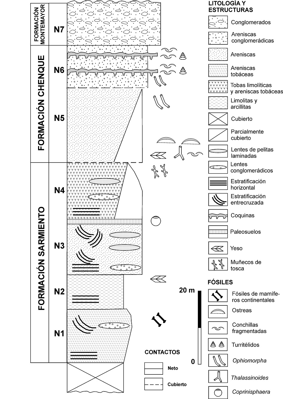 El nivel 1 se caracteriza por la presencia de tobas finas macizas y de segundo ciclo (retransportadas) con restos de fósiles de mamíferos continentales. Se asocian intercalaciones de limolitas y areniscas finas y medias con laminación paralela, ocasionales lentes conglomerádicos intraformacionales y niveles de minerales opacos. Mediante contacto erosivo, se deposita por encima el nivel 2, caracterizado por pelitas de color rosa claro con laminación paralela y limolitas de color castaño claro con tonalidades verdes. Hacia la parte superior, la secuencia pasa a arcillitas macizas de color castaño rojizo oscuro. El contacto con el nivel 3 es neto y resalta la presencia de yeso. Este nivel se caracteriza por las areniscas grises con estratificación paralela y entrecruzada con niveles de minerales opacos. Se observan, además, intercalaciones de lentes de conglomerados intraformacionales y de bancos tabulares de arcillitas castañas rojizas de hasta 7 cm de espesor. Hacia el tope, se destacan en este nivel paleosuelos superpuestos con abundantes huecos de tipo canales (paleosuelo con desarrollo de bioturbaciones o pedotúbulos) y muy escasos nidos de escarabajos estercoleros (icnogénero Coprinisphaera, Bellosi et al., 2010). El nivel 4, sin estructura en la base, se caracteriza por la presencia de areniscas de color rojizo y lentes conglomerádicos y arenosos. Se observan, además, abundantes muñecos de tosca en la superficie. El nivel 5 presenta areniscas bioclásticas de color gris amarillento, moderadamente consolidadas, sin estructura. Se observan frecuentes rellenos de bioturbaciones tubulares de distribución vertical. El tope se encuentra cubierto con material coluvial. El nivel 6 presenta intercalaciones de bancos duros de coquinas de color castaño amarillento compuestos fundamentalmente por turritelas y areniscas grises bioclásticas y arcillitas. En el tope de los bancos duros se observa el desarrollo de megaóndulas de amplitud máxima de hasta 50 cm. En la base de los bancos duros, se observa un contacto erosivo con abundantes moldes de carga y bioturbaciones y estructuras de corte y relleno. Las areniscas son macizas, medianamente consolidadas y presentan escasas conchillas fragmentadas e intercalaciones de hasta 30 cm de espesor de arcillitas de color gris verdoso con laminación fina y manchas de óxidos de hierro. El nivel 7 corresponde a la Formación Montemayor (Rodados Patagónicos), compuesta por areniscas muy gruesas a sabulita que forman bancos endurecidos con cierta estratificación entrecruzada grosera. En sectores, se observan intercalaciones de areniscas finas a medianas friables. Hacia el tope se observan depósitos de conglomerados de gravas arenosas con recubrimientos calcíticos sobre gravas y acumulaciones de carbonatos.