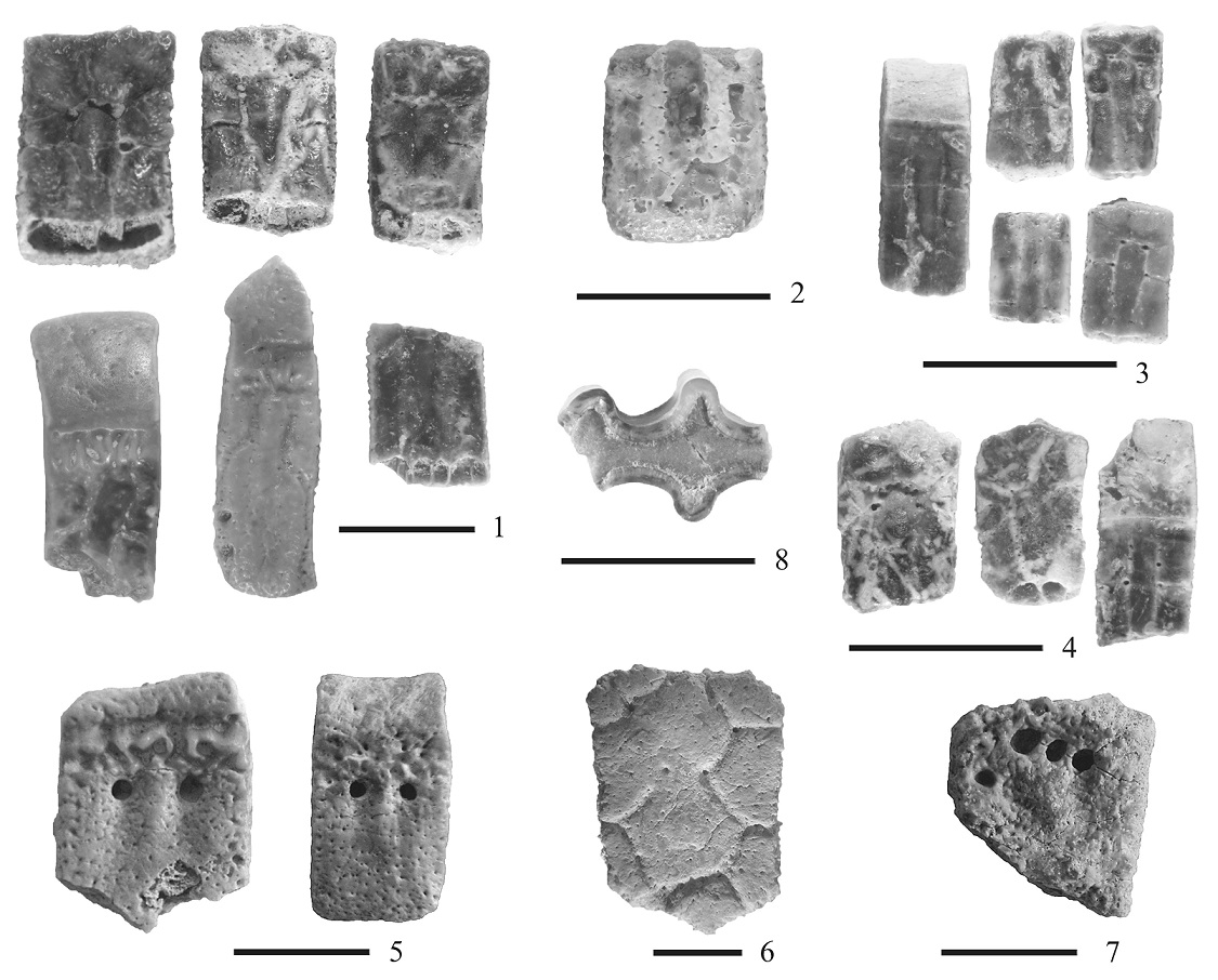 Material referido: MPEF-PV 2546/1-3, tres osteodermos fijos de la coraza dorsal; MPEF-PV 2546/4-6, tres osteodermos móviles.