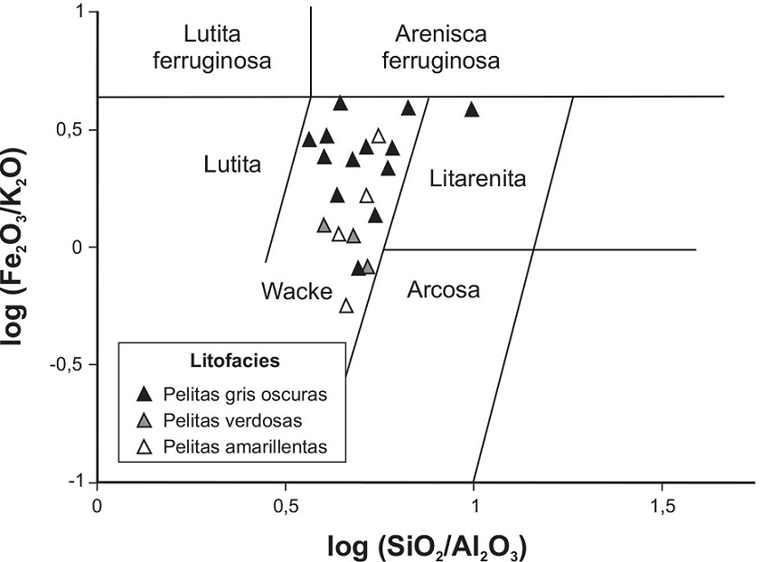 En la clasificación geoquímica de rocas silicoclásticas de Herron (1988), donde se confrontan log Fe2O3/K2O versus log SiO2/Al2O3 (Fig. 4), la gran mayoría de las rocas estudiadas se ubica en el campo de las ‘wackes’. El contenido relativo de Fe2O3 y K2O es variable, mientras que el de SiO2 y Al2O3 es más uniforme. La proporción de Al2O3 con respecto a SiO2 no alcanza para que las muestras se ubiquen en el campo de las lutitas. Por tanto, aun cuando se trata de rocas de grano fino, las sedimentitas analizadas de la Formación Vaca Muerta muestran un contenido relativamente elevado de sílice.