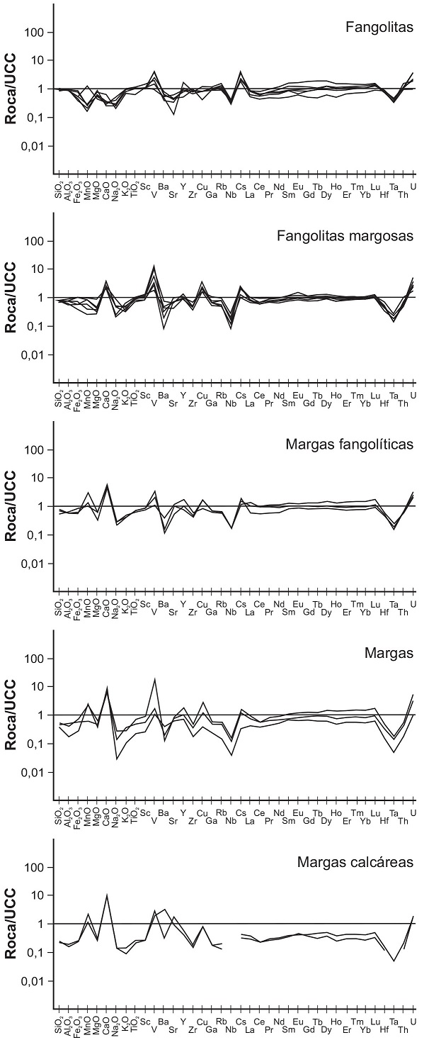En relación con los tipos litológicos definidos geoquímicamente, el Mo muestra el valor promedio máximo en las fangolitas margosas, los máximos medios de U, V y Ni se encuentran en las margas y fangolitas margosas, mientras que los valores promedios máximos del Ni se registran en las fangolitas margosas y margas fangolíticas (Tabla 3). Por tanto, de cinco elementos traza que son potenciales indicadores de condiciones redox, ninguno posee los valores más altos asociados con el tipo litológico que se caracteriza por los mayores porcentajes de sílice (i.e., fangolitas, cf. Tablas 1, 3). De estas relaciones se deduce que probablemente en la cuenca existía una relación inversa entre factores geológicos que colaboraban en el suministro de terrígenos y aquellos que favorecían condiciones de empobrecimiento de tenores de O en la interfase agua-sedimento.