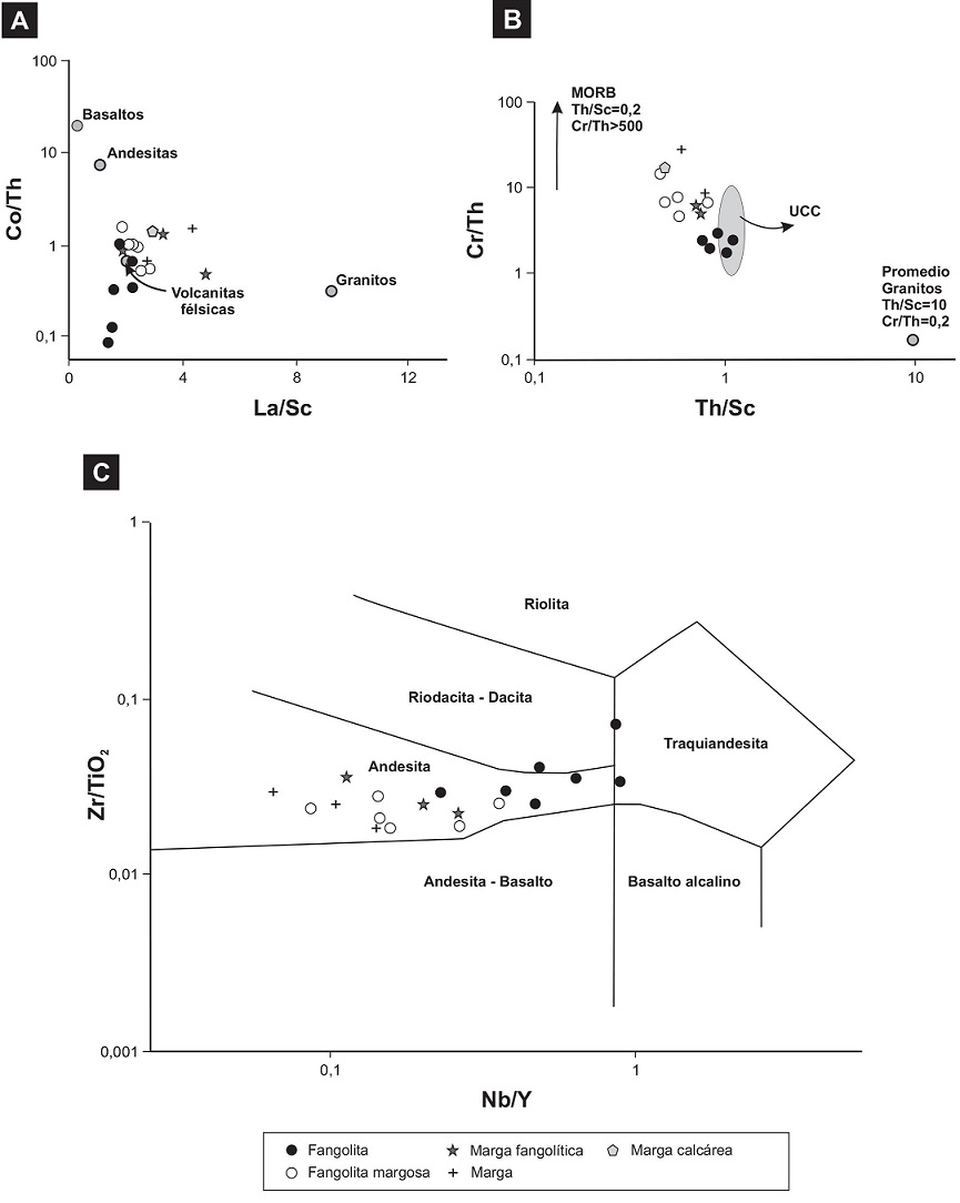 En el diagrama K versus Rb (Floyd y Leveridge, 1987) las sedimentitas estudiadas se ubican preferentemente en el campo de las composiciones ígneas ácidas a intermedias (Fig. 10C). El diagrama ternario de Miyashiro (Fig. 11) indica que las rocas estudiadas (en particular las fangolitas) tienen afinidad con las rocas ígneas calcoalcalinas. En tanto, en los diagramas Co/Th versus La/Sc (Gu et al., 2002) y Cr/Th versus Th/Sc (Asiedu et al., 2004) (Figs. 12A y B) las sedimentitas se distribuyen en áreas de las rocas félsicas, con relativamente elevados contenidos en Th y Sc en las fangolitas respecto a la media de UCC (Fig. 13). En el diagrama clasificatorio de rocas volcánicas de Winchester y Floyd (1977) las sedimentitas se emplazan en el campo de las andesitas (Fig. 12C).