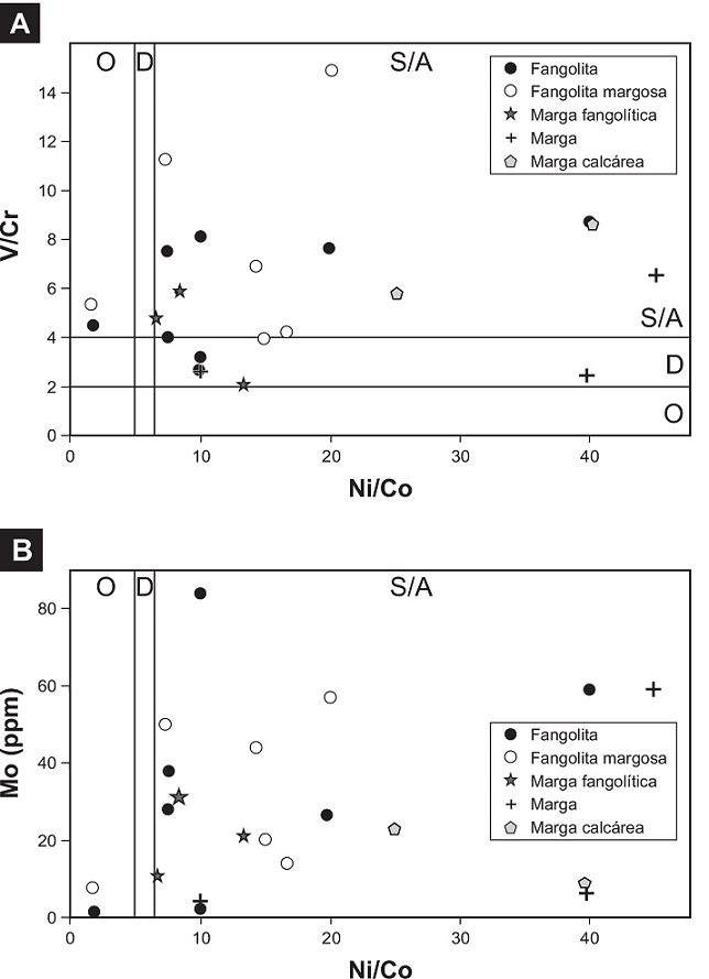 Fig. 17. Diagramas de variación V/Cr versus Ni/Co (A) y Mo versus Ni/Co (B), según Rimmer (2004). O: ambiente óxico. D: ambiente disóxico. S/A: ambiente subóxico a anóxico. Las muestras estudiadas se emplazan preferentemente en las áreas correspondientes a ambiente subóxico/anóxico. |