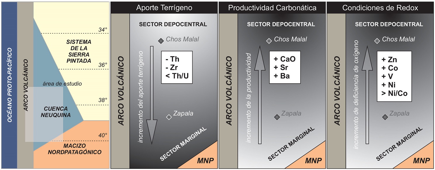 En sentido regional, las facies de pelitas verdosas y de pelitas amarillentas, entre las que dominan ampliamente los tipos litológicos fangolíticos (con abundante material silicático) se concentran el sector marginal (austral) de la Cuenca Neuquina, en tanto que la facies de pelitas gris oscuras, constituidas por muy diversos tipos litológicos entre los que prevalecen las fangolitas margosas, caracterizan al ámbito depocentral (sector norte del área de estudios). Los aportes terrígenos, manifestados por los contenidos de Th y Zr y los valores de la relación Th/U, son más importantes en el sector sur del área de estudios y caracterizan a las facies silicoclásticas de la zona marginal austral de la Cuenca Neuquina. Por su parte, tanto los indicadores de productividad carbonática (CaO, Sr, Ba) como la mayoría de los elementos sensibles a las condiciones de redox o de ambientes con mayor deficiencia en oxígeno (Zn, Co, V, Ni, Ni/Co) muestran sus mayores valores en el sector norte (depocentral) del área de estudios.