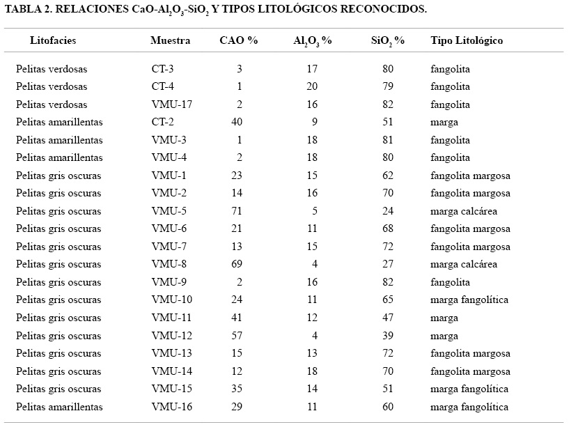 - El análisis geoquímico, y particularmente las proporciones de Al2O3, SiO2 y CaO, permitió establecer que no todas estas sedimentitas tenían carácter silicoclástico. Se definieron así tipos litológicos silicáticos (fangolitas) hasta híbridos (margas y margas calcáreas). Entre ambos extremos composicionales, se registra toda una serie de tipos litológicos intermedios