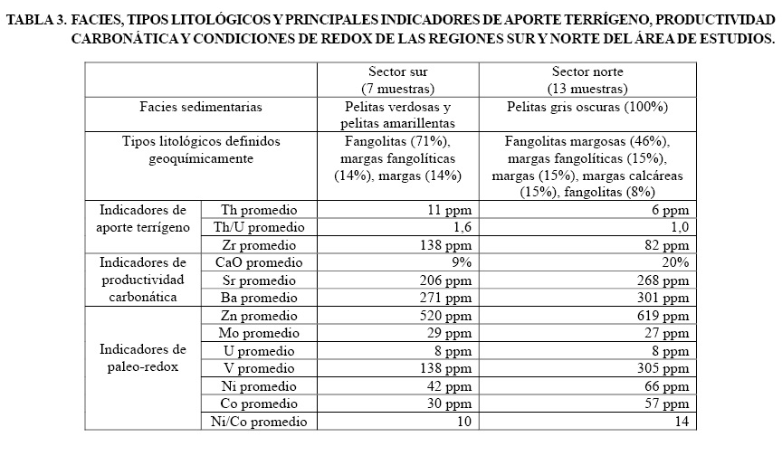 - En sentido regional se definen importantes variaciones geoquímicas. En el sector marginal de la cuenca, donde dominan las fangolitas, son importantes los contenidos de los indicadores de aporte terrígeno (Th, Zr, Th/U). En el sector depocentral, caracterizado por la facies de pelitas gris oscuras, se hacen más importantes los indicadores de productividad carbonática (CaO, Sr, Ba) y de condiciones ambientales con mayor deficiencia en oxígeno (Zn, Co, V., Ni, Ni/Co).