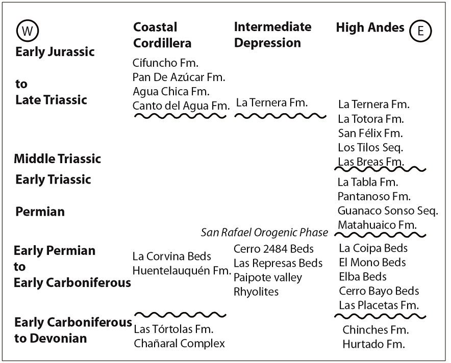 In the High Andes a U-Pb age of 291.5±4.0 Ma was obtained for an andesitic tuff intercalated in the upper section of El Mono Beds (sensu Mercado, 1982; Mpodozis et al., 2012), which is a mostly alluvial and lacustrine sedimentary succession, ca. 1,000 m thick, formed of sandstone and conglomerate strata that unconformably overlie Devonian to Early Carboniferous sandstones of the Chinches Formation in the High Andes at ~27°S (Fig. 4) and underlies in apparent conformity Jurassic marine strata (Mercado, 1982; Mpodozis et al., 2012). This sedimentary-volcanic succession was previously attributed to the Late Triassic based on fossil flora and conchostracans (Davidson et al., 1978; Mercado, 1982; Suárez and Bell, 1991; Blanco, 1994; Cornejo et al., 1998; Gallego and Covacevich, 1998; Mpodozis et al., 2012).