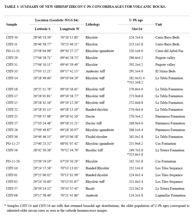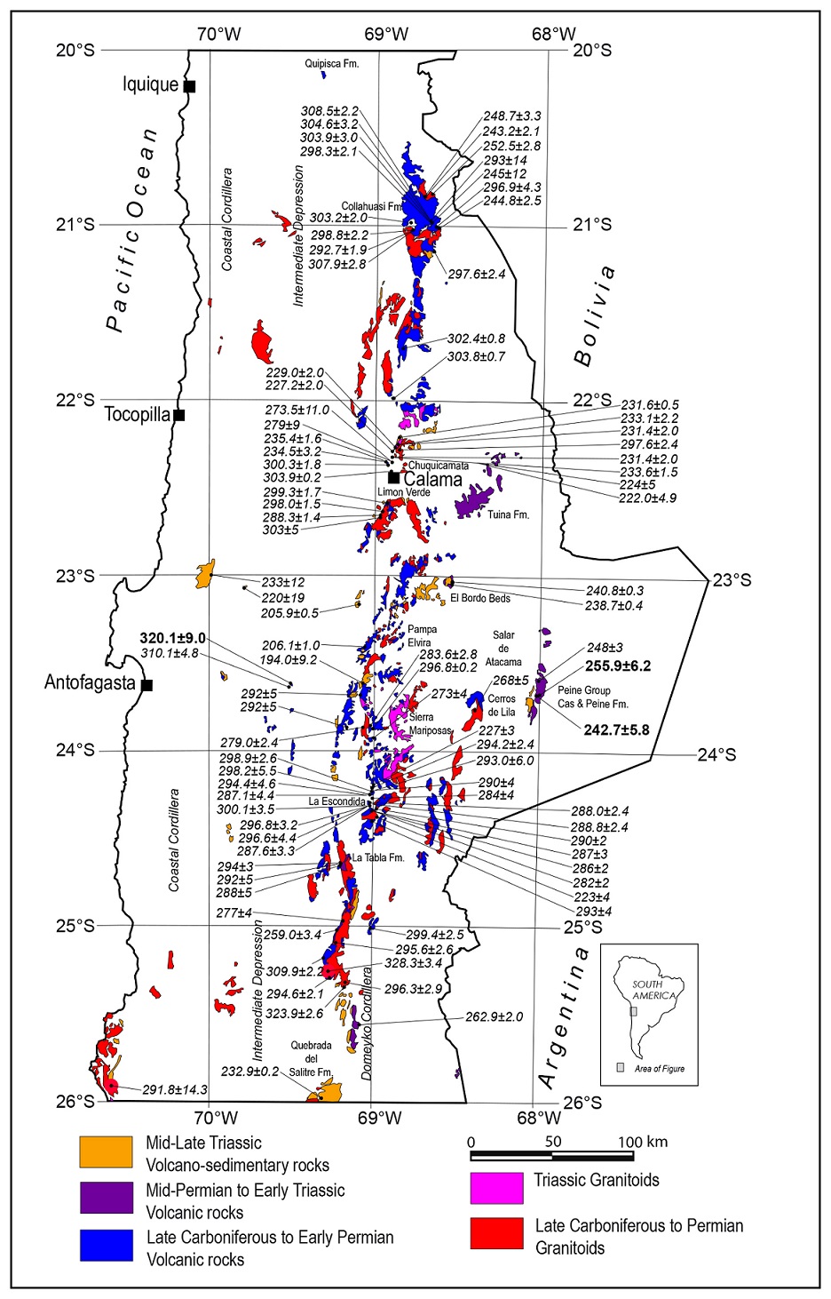 The correct allocation of lithostratigraphic units to the geological time results in changes in the stratigraphy modifying the tectonic interpretation and evolution of the studied volcano-plutonic event. The current U-Pb data allow a better understanding of the temporal evolution of the Late Paleozoic to Early Jurassic volcano-plutonic event in northern Chile, but certainly further work is required to solve particularly stratigraphic problems still remaining and some outcrops that have not been sampled by logistic reasons.
