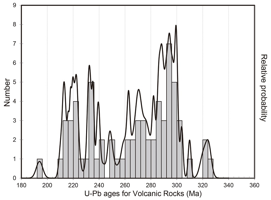 Fig. 5. Probability density plot and stacked histogram of zircon U-Pb ages for volcanic rocks. |