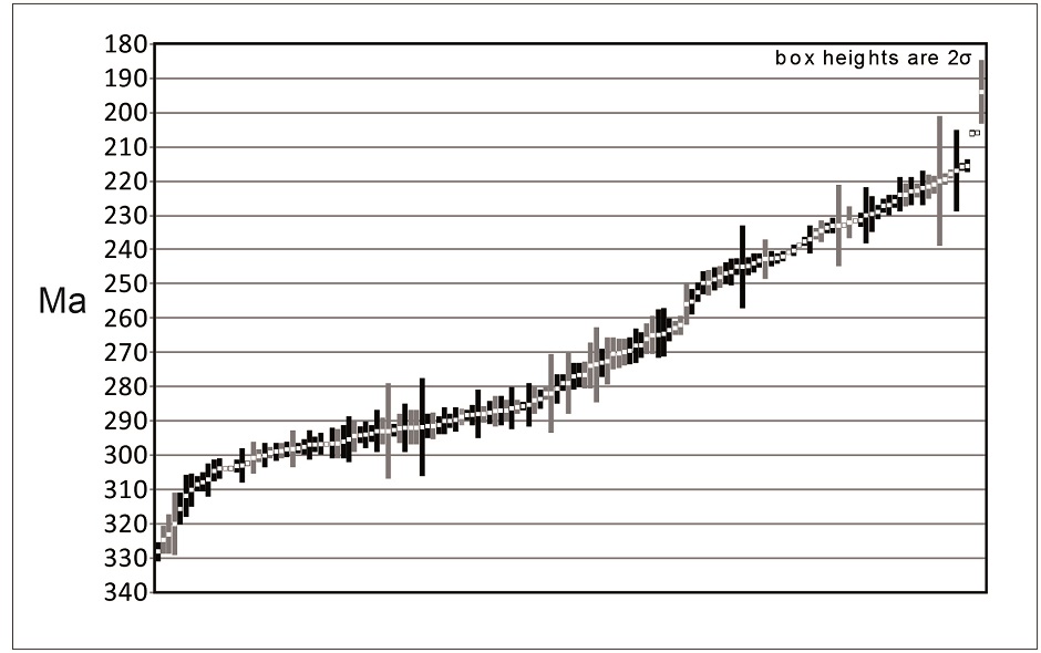 The new zircon U-Pb ages for Late Paleozoic intrusive rocks range from 315.7±4.6 to 229.6±5.2 Ma (Table 4), well within the 328 to 206 Ma interval of the compiled U-Pb dates (Table 2).