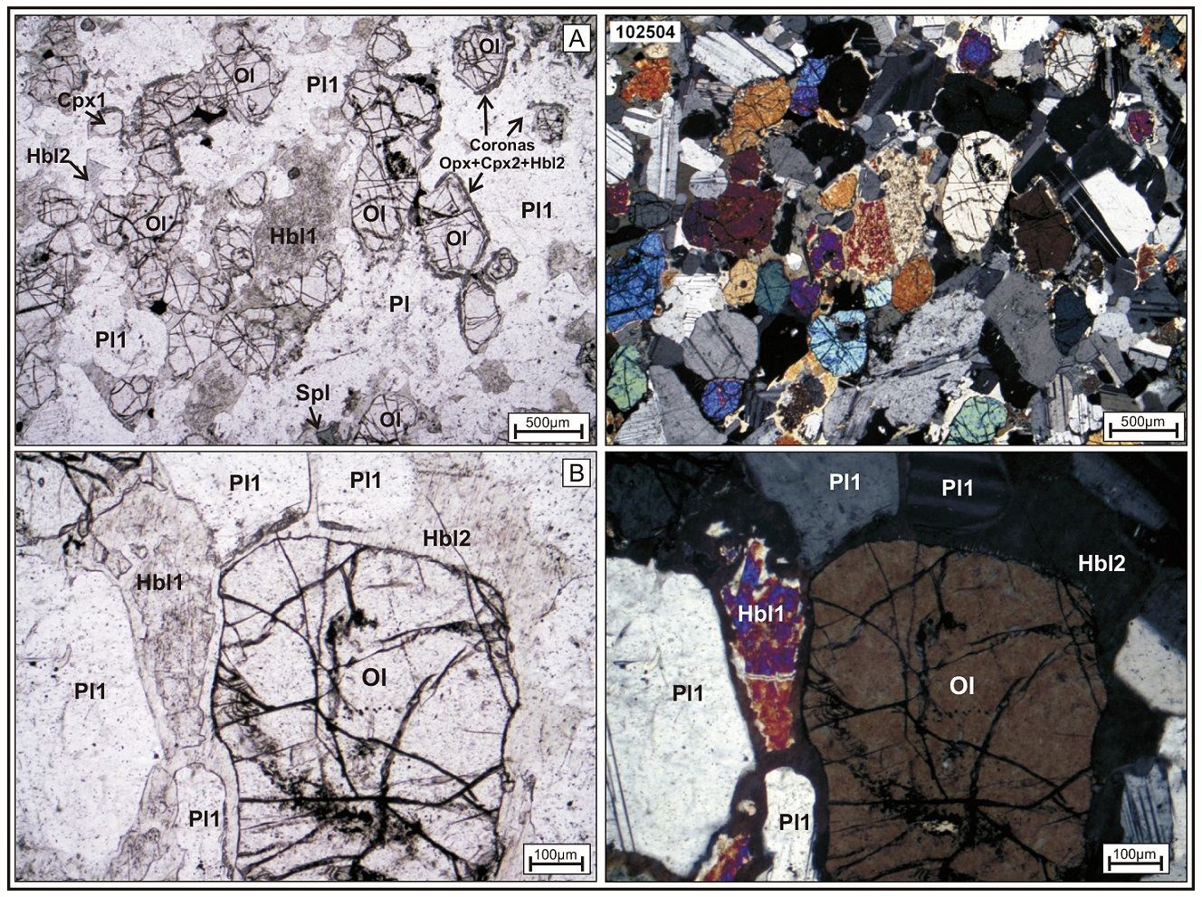 - The primary-magmatic association composed mainly of Pl1+Ol+Cpx1+Hbl1, was re-equilibrated during the post-emplacement thermal descent giving place to the formation of coronas around olivine crystals, with successive formation of orthopyroxene, clinopyroxene (Cpx2), amphibole (Hbl2) and spinel.