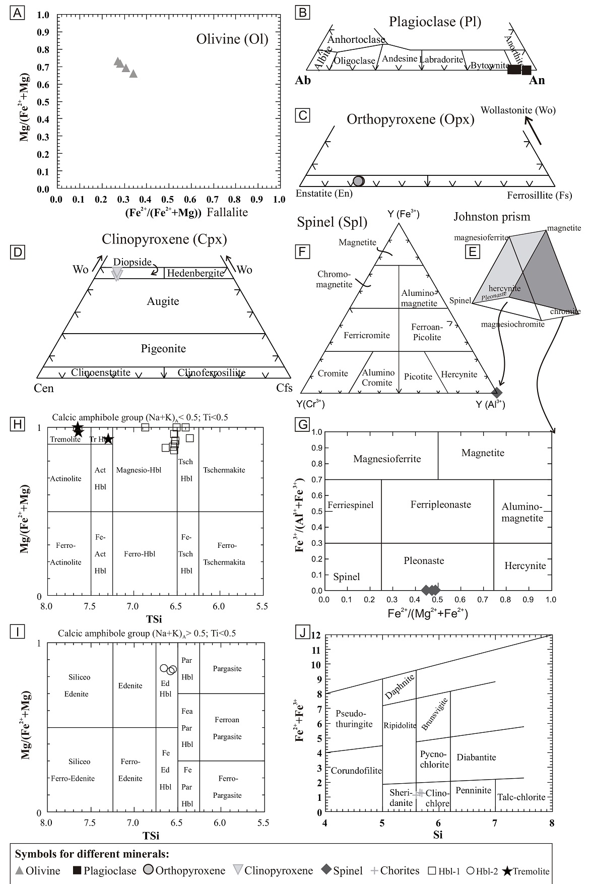 Fig. 7. A. Olivine classification diagram (isomorphic binary series forsterite-fayalite, based on the Mg/Mg+Fe2+ and Fe2+/Fe2++Mg proportions; B. Ab-An-Or ternary diagram; C. Ternary diagram for orthopyroxene classification. Observe the intermediate compositions of the isomorphic series between the end-members enstatite (En) and ferrosilite (Fs); D. Ternary diagram for classification of clinopyroxene. Note the intermediate compositions of the isomorphic series between the extremes clinoenstatite (Cen) and clinoferrosilite (Cfs); E. Prism of Jhonston for classification of spinel group minerals; F. Triangular diagram of trivalent cations (Fe3+-Cr3+-Al3+); G. Diagram of spinel classification according to the relative proportions of bivalent and trivalent ions; H. Classification of calcic amphiboles [(Na+K)< 0.5, Ti< 0.5] according to Leake et al. (1997); I. Classification of calcic amphiboles [(Na+K)>0.5, Ti< 0.5] according to Leake et al. (1997); J. Chlorite classification diagram (taken from Deer et al., 1992). |