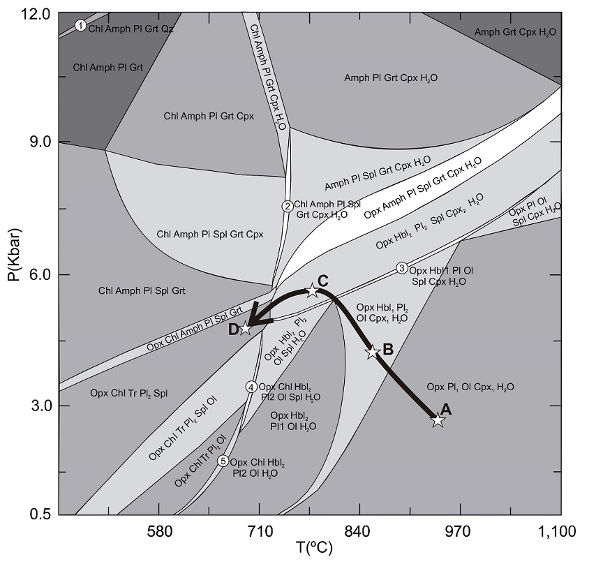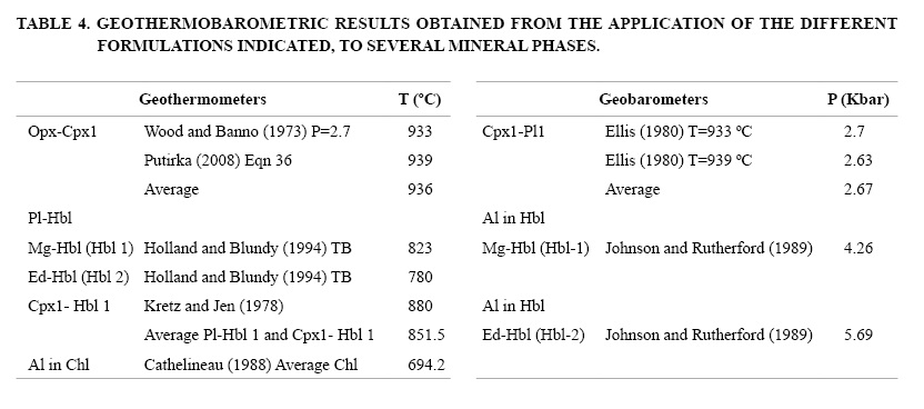 Finally, the presence of chlorite allows estimation of a temperature of 694 ºC, calculated with the formulation Al-in-Chl of Cathelineau (1988). According to pseudosection of figure 8, the formation of chlorite is associated to the total consumption of water and clinopyroxene present in the previous paragenesis, giving place to the new stable association Pl+Opx+Amp+Spl+Chl. Considering the calculated temperature for chlorite, a range of pressures can be estimated considering the absence of olivine in the above listed association which fix a minimum pressure at ~4.5 Kb, and the entire absence of garnet in these rocks establishing a maximum pressure of ~5.2 Kb (Fig. 8). Letter D in figure 8, is located in the middle of these values and at the calculated temperature. Taking into account that the continuity of the trajectory is limited by the last stability field, the trajectory must continue along a path characterized by the decrease of temperatures and pressures (Fig 8).
