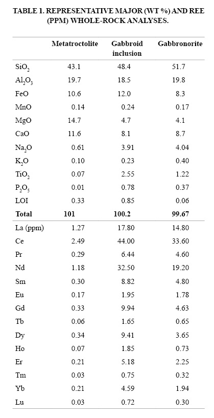 The representative geochemical composition of metatroctolites is presented in Table 1. According to its SiO2 content (43.1%), this rock is located close to the limit between basic and ultrabasic rocks following the Le Maitre (1989) silica content classification. Taking into account that the mineral proportions of ferromagnesian minerals in the studied metatroctolites are significantly lower than 90%, these rocks are considered to be mafic. The alkalis sum (Na2O+K2O=0.71) and calcium content (11.62%), point to a sub-alkaline signature. In addition, this magnesian-rock presents an XMg=0.73 (in atomic proportions) and very low TiO2 (0.068%). Considering its chemical and mineralogical composition, these metatroctolites can be compared with gabbronorites and gabbroic inclusions in granodiorites found in the same sector of the AIMC. The above mentioned rocks with SiO2 contents in the range 48.38-51.65% and total alkalis of up 4.44% would correspond to more evolved facies. Compared with the metatroctolites, these rocks are richer in iron (XMg=0.41-0.47) and TiO2 (1.22-2.55%).