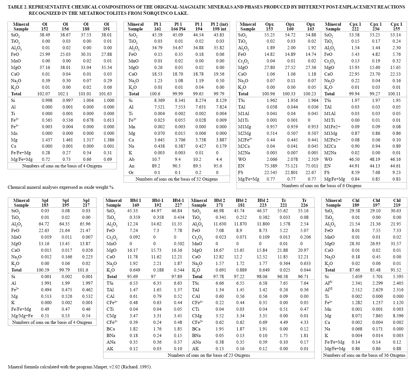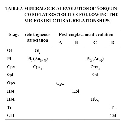 The sequence of mineral re-equilibrations in metatroctolites from Ñorquinco lake is shown in Table 3. The original igneous association is constituted by Ol+Pl1+Cpx1. First replacement textures are represented by the growth of Opx on Cpx1 crystals (stage A in Table 3). The appearance of Hbl1 due to hydration of the previous phases form the association corresponding to stage B. Spl, Hbl2 and Pl2 formed during stage C. Stage D is characterized by the late formation of Tr and Chl.