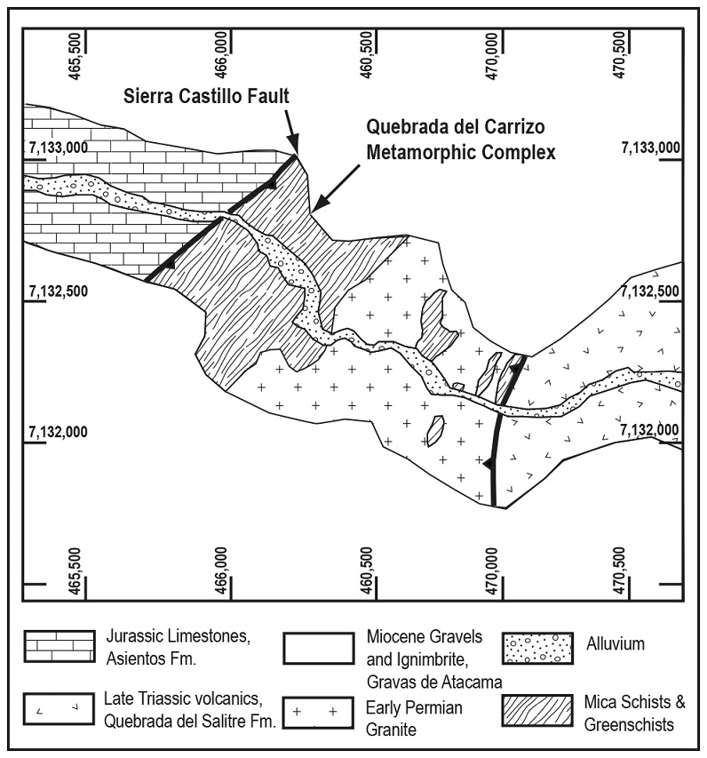 The schists of Quebrada del Carrizo in part occur as enclaves within sheared, medium-grained granite and are bounded by the east-dipping Sierra del Castillo thrust fault to the west and by another west-dipping thrust fault to the east (Fig. 2). These faults have been interpreted by Niemeyer (1999) as forming a sinistral, transpressive, tectonic wedge developed during the Eocene-Oligocene. The schists of the Quebrada del Carrizo are deformed into isoclinal folds with superimposed asymmetric folds and crenulation with fold axis near parallel with the main foliation that strikes NE and dips from 35° to 70° to the east.