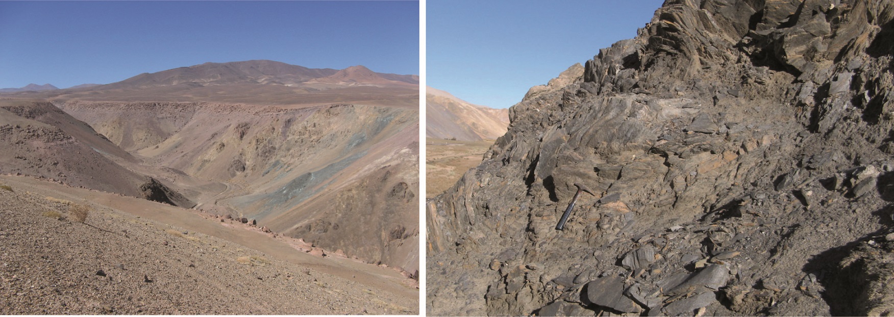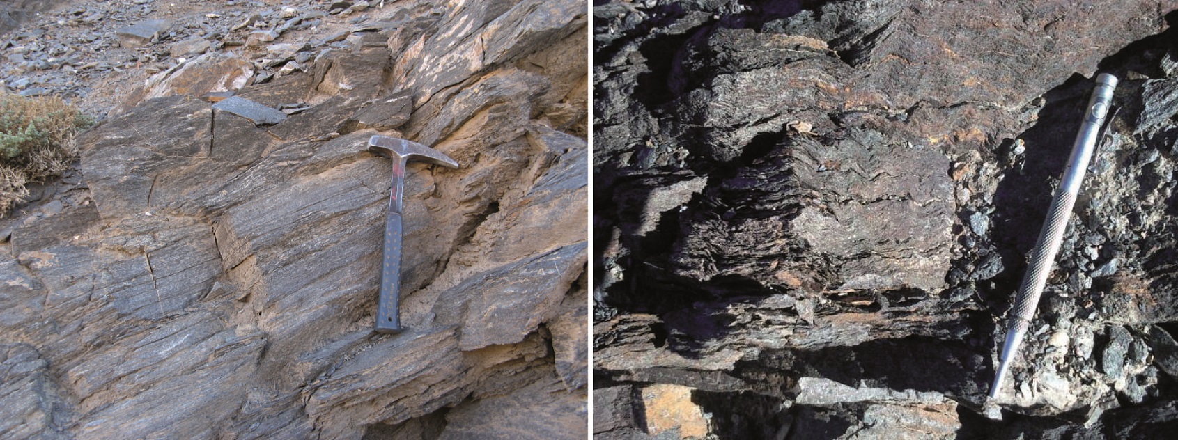 The metamorphic rocks at the del Carrizo creek are exposed on the both flanks of the east-west-trending canyon-valley (Figs. 2 and 3), under a flat cover of Miocene welded tuffs (Llano Las Vicuñas ignimbrites; Cornejo et al., 2009), and overlying Upper Miocene to Pliocene alluvial gravels (Atacama Gravels; Cornejo et al., 2009).