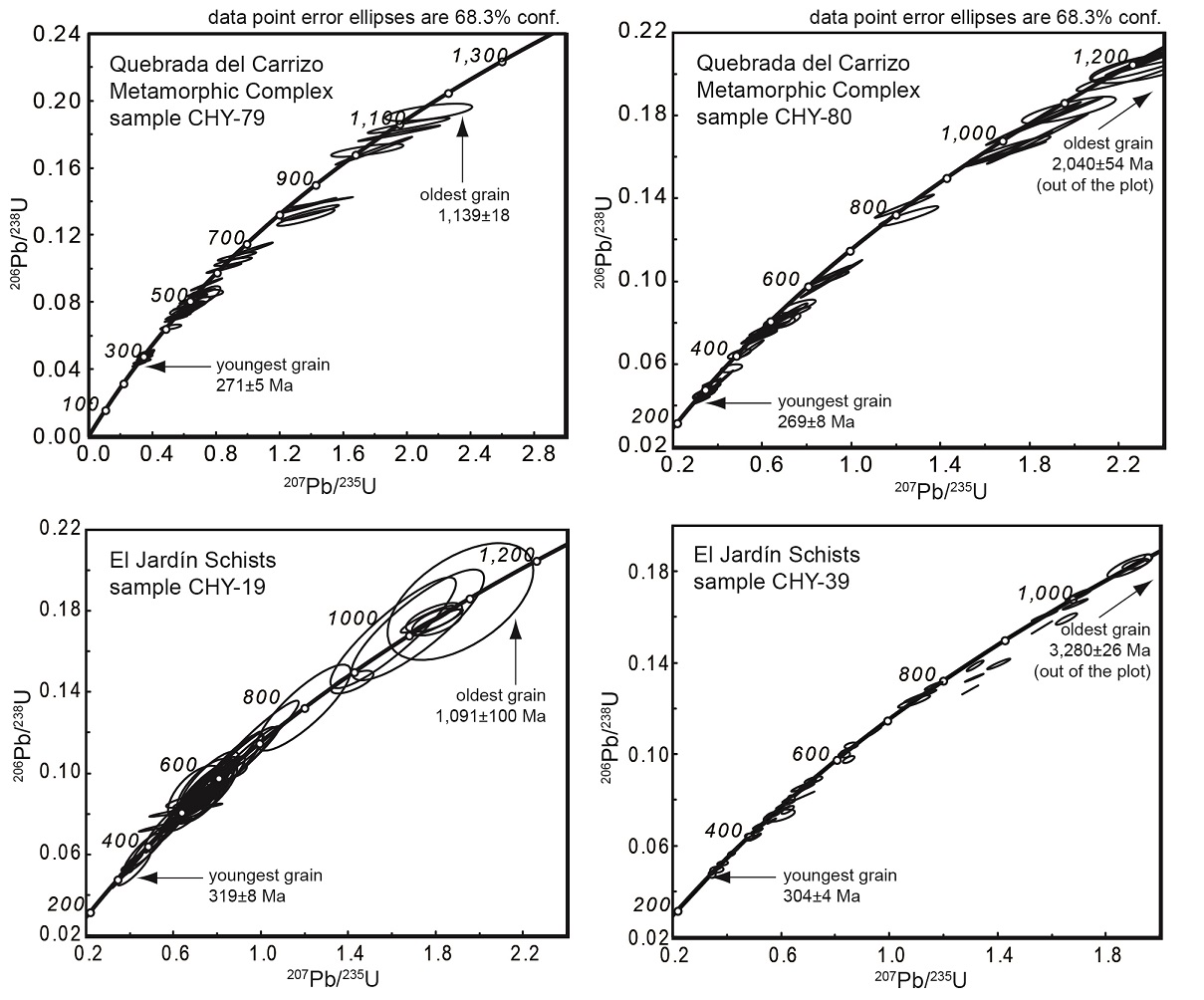 The maximum depositional age estimates of table 1 consistently correspond to Late Carboniferous for the El Jardín Schists and Early Permian for the Quebrada del Carrizo Metamorphic Complex; 314±11 Ma and 291±5 Ma, respectively, if the youngest most statistically robust values of table 1 are considered.