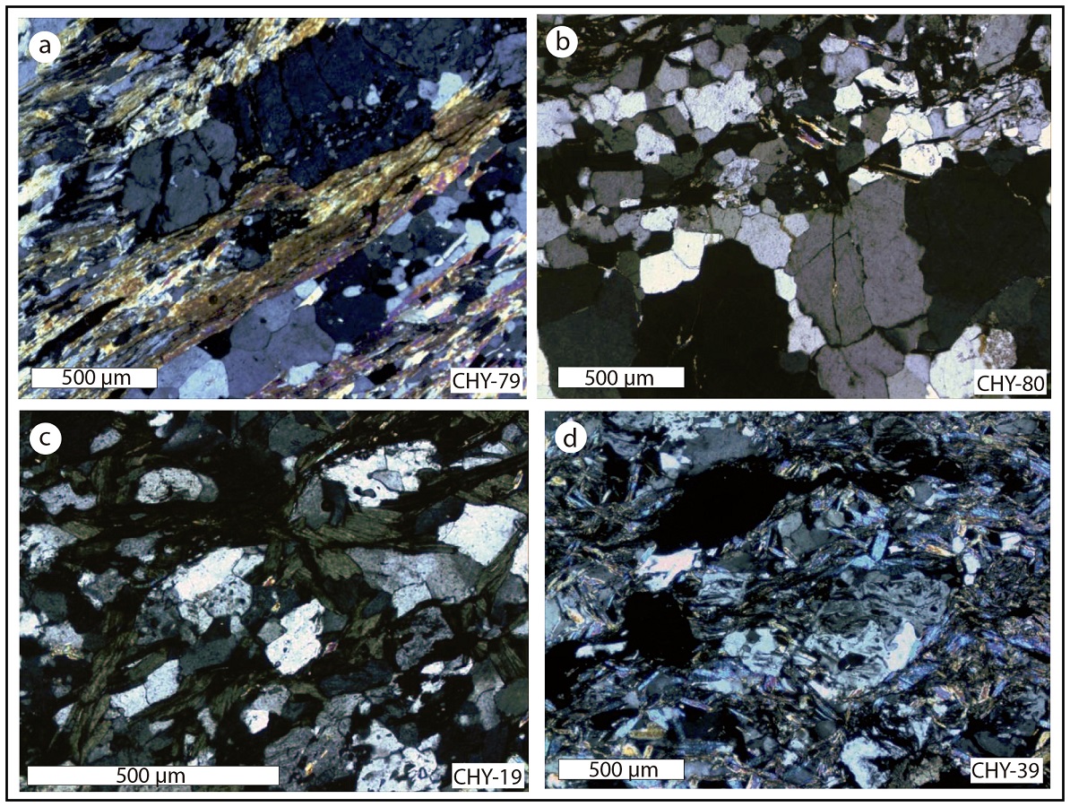 The granite intruded within a fold hinge in the Jardín Schists (CHY-74; Fig. 7) is medium-grained, leucocratic rock with hypidiomorphic granular texture and composed of quartz, plagioclase and orthoclase, with less than 10% of chlorite, muscovite, and opaque minerals that appear to have completely replaced biotite. The quartz grains show undulatory extinction and subgrains, some plagioclase are bent and show wedge twins, but also microfractures, indicating ductile and fragile deformations of the granite. The tonalite (CHY-19a) is a medium-grained, mesocratic rock with hypidiomorphic granular texture and composed mainly by plagioclase and hornblende and minor biotite and quartz; it has a foliation defined by preferential orientation of tabular minerals (Fig. 7). The quartz grains show undulatory extinction and plagioclase grains have wedge twins and microfractures, indicating also ductile and fragile deformation of the tonalite.