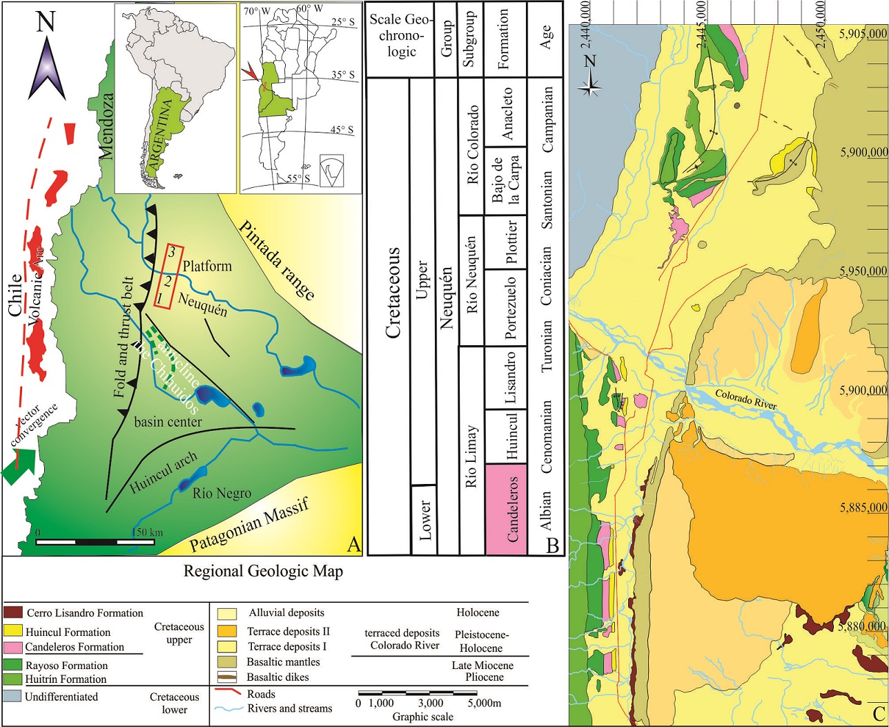 Fig. 1. A. Map of Neuquen Basin (modified from Cobbold and Rosello, 2003; Manacorda et al., 2004; Ramos and Folguera, 2005), with major structural features. To the west the volcanic arc and Fold - and - Thrust Belt NE verging to the Cretaceous; to the south, the Huincul arch. The study area is indicated by the red rectangle in the center of the figure and signalled by arabic numerals (1-3); B. Table of chronostratigraphic Neuquen Group (in pink stratigraphic unit studied); C. Geological map of the study area.