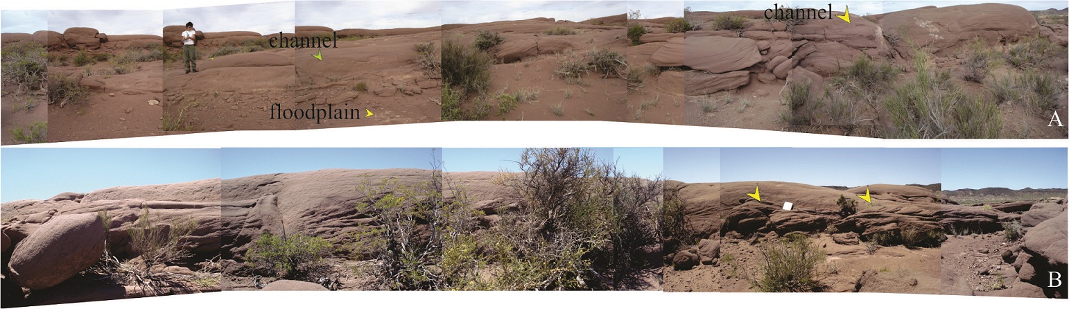 The distribution of geomorphic features reflect paleogeographic zonation in the development of interconnected channels that suffered frequent avulsion processes, acting in some cases simultaneously in different sections of a terminal fan. A floodplain with condensed sections (Pl) reflects periods of low supply. The abundance of tree fragments in the overflow elements suggests that an arboreal vegetation associated with the channel edge was eroded during events of high water discharge, and that there were sediments in suspension in the floodplain that were rapidly deposited during the decline in flow energy (Devaney, 1999). Larger trunks trapped in the channels deformed underlying sediment structures and their orientation is oblique to main paleocurrent direction. This allows to infer deposition from suspension during the final stages of a major flood event.