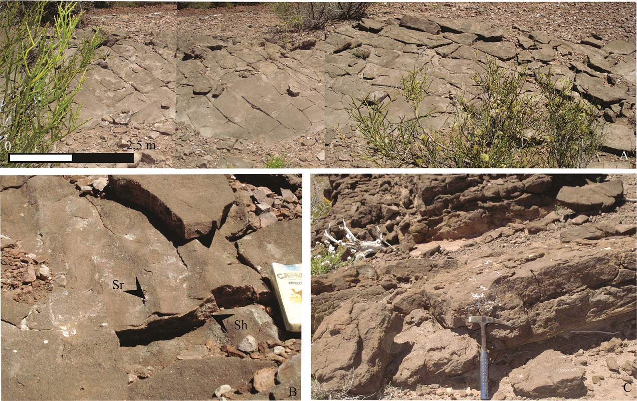 The outcrops in this study (Fig. 1) represent both types of a terminal fan basin margin, and were selected based on the quality and continuity of exposure, abundance of sandstone, accessibility, and their potential for expanded, detailed studies. The methods used for the collection and analysis of data from the Candeleros Formation in the west-central Neuquén Basin follow a stratigraphic and sedimentological approach: a survey of 3 sections over 15 km with identification of the different integrating sedimentary units (Figs. 1a and c). Facies analysis and mapping was completed on photomosaic outcrop maps. This technique was used to define lithosomes and their bounding surfaces. We identified the lithology, sedimentary structures (Table 1), geometry of the deposits and paleocurrent data, which were then analyzed statistically. Also, extensive outcrops were photographed in order to identify and document any architectural elements (Table 2) present in accordance with the methodology proposed by Miall (1985). In addition, we carried out an integrated profile development at a scale of approximately 1:20 (Fig. 2) in order to provide detailed documentation of the facies profiles. Their identification and interpretation, together with the analysis of associations and architectural elements at meso-macro scale allowed the identification of processes involved in the development of the terminal fan units.