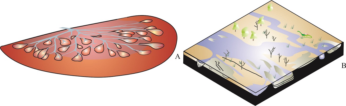 Fig. 5. Distributary zone-basinal zone deposits (TF-DZBZ). A. Low sinuosity channels that migrate in a large floodplain; B. Arrows indicate accretion and migration of transverse bars and linguoides.