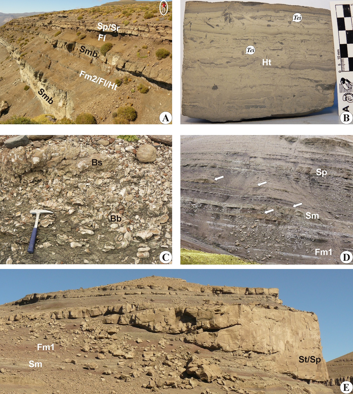 Subfacies D3 is dominated by fine-grained lithofacies such as Fl and Ht. It grades upward into D1 and D2. The exposure of this subfacies is poor although in some concretionary levels it shows delicate heterolithic lamination with minute Teichichuns isp. and Planolites isp. (Fig. 5B).