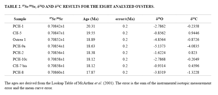 The eight 87Sr/86Sr ages range from 20.31 to 17.87 Ma (Table 2) and span the entire thickness of the El Chacay Formation (ages indicated with red numbers in Fig. 2). Ages cluster into two intervals separated by another interval corresponding to the maximum flooding zone, which lacks datable oysters. The stratigraphically lower interval yielded ages of 20.31Ma and 19.55 Ma, whereas the upper interval yielded ages from 18.89 Ma to 17.87 Ma. The six dates in the upper interval span little more than 1 Ma and four of them belong to the Puesto el Chacay Section (Fig. 2). There, some calculated ages reverse the stratigraphic order of the samples and indicate that errors in the age calculation are significant in relation to the time involved in the accumulation of the interval. Errors in age calculations arise from the method itself (analytical error ±0.2 Ma for the look-up table) but also may arise from local modifications of the isotopic composition of the seawater at the time the oysters were formed, or from diagenetic changes in the oyster shells.