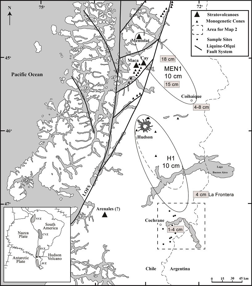 All these recent results are consistent with the previous conclusions of Stern (1991, 2008) and Naranjo and Stern (1998, 2004) that the H1 and H2 eruptions of Hudson and MEN1 of Mentolat, along with the older Ho (Weller et al., 2014) and younger H3 (1991 AD; Scasso et al., 1994) eruptions of Hudson, were among the largest Holocene explosive events generated by the volcanoes in the southern SVZ. The tephra deposits produced by all these eruptions have already and will continue to provide important chronological markers for archaeologic (Prieto et al., 2013) and paleoclimate (Waldmann et al., 2009; Borromei et al., 2010; Unkel et al., 2010; Hermanns and Biester, 2011; Björck et al., 2012; Villa-Martínez et al., 2012; Menounos et al., 2013; McCulloch et al., 2014) studies in southern Patagonia. For these reasons, as well as being significant for evaluating volcanic risks and hazards for the inhabitants of Cochrane and other population centers in southern Chile, further study of tephra deposits produced by these large explosive eruptions are important for refining our understanding of their size, age and the distribution of the pyroclastic products they produce.