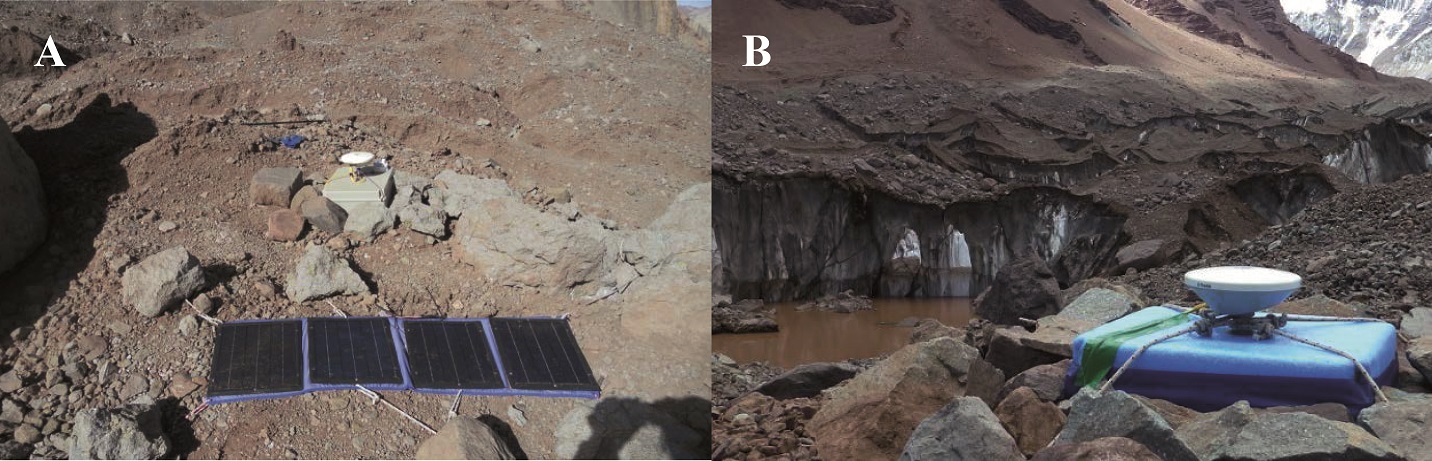 FIG. 2. A. HIS1 GNSS station with the antenna mounted on a box platform on the glacier; B. HIS4 station on the HIG surface.