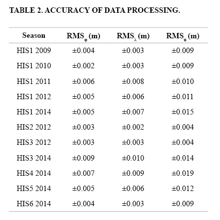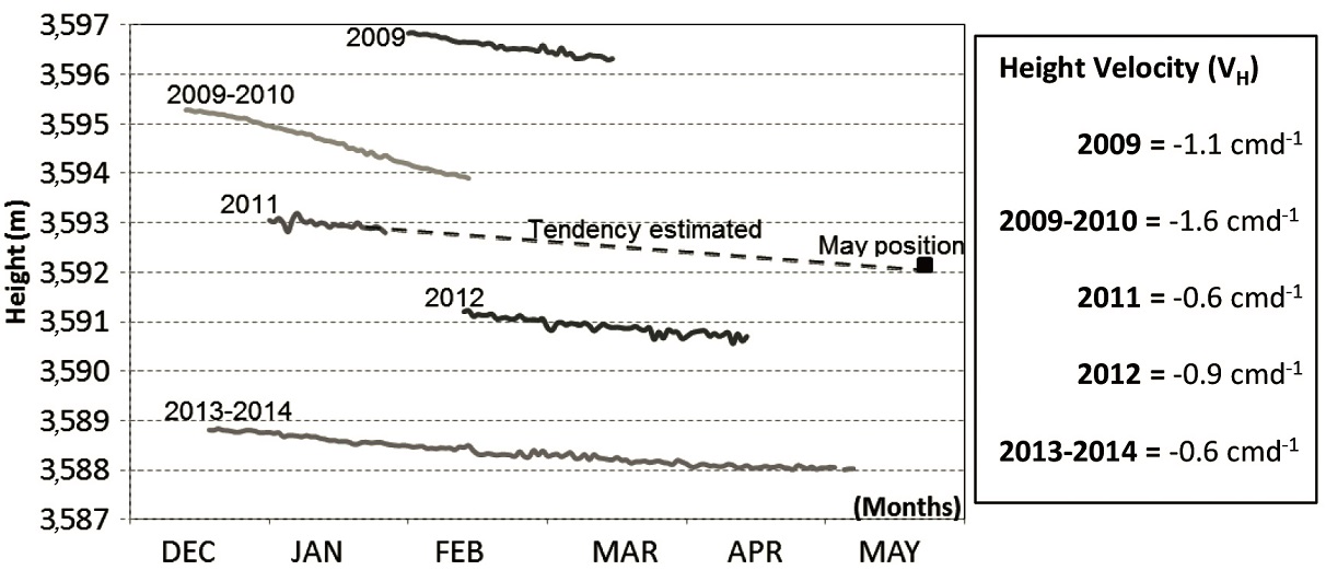 Figure 5 shows the daily rate of the HIS1 station horizontal position changes during the five seasons. The data displays horizontal surface displacements that are similar for the five periods, except for the 2009-2010 season. The mean surface velocities for HIS1 are listed in Table 3, where the accuracy and also the surface movement’s direction are shown. The VS (Surface velocity) values estimated during the 2009 and 2009-2010 field seasons were similar, but the motion rate was reduced by approximately 50% in the following seasons, indicating that the glacier was slowing down and reducing the advance rate towards the terminus. The VH represents a spatial pattern of glacier movement. The lowest velocity, -0.6 cmd-1, and the highest one, -1.6 cmd-1, were observed in the 2013-2014 and 2009-2010 field seasons respectively, with an average velocity of -0.96 cmd-1 for the whole 2009-2014 period. The seasonal VH changes showed an interesting pattern in the 2009-2010 season, due to an increase of approximately 45% in the rate of diminishing elevation change. From December 2010 onwards, the altitude changes began to stabilize and are more constant values in later field seasons.