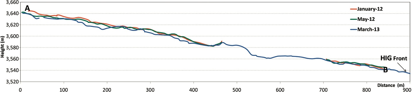 An axial profile in the ablation zone, across the HIS1, HIS2, and HIS3 sites was surveyed to determine elevation changes of the surface in January 2012, May 2012, and March 2013 respectively (A-B, Fig. 3). For every season, the profiles were measured at the same horizontal coordinates (Lat. and Lon.), replicating the profile trajectory by GNSS kinematic surveys. During the first two seasons, there was a discontinuity in the trend of data due a large depression similar to a thermokarst that interrupts the central part of the glacier (see Fig. 4). Thus, this area cannot be taken into account because it was not possible to continue the line of the axial profile. By March 2013, the surface had smoothed in this area and the profile A-B was continuous. The survey area covered the lowermost kilometer approximately of the HIG. A dual-frequency Trimble 5700 with a data acquisition rate of 5 seconds was used.