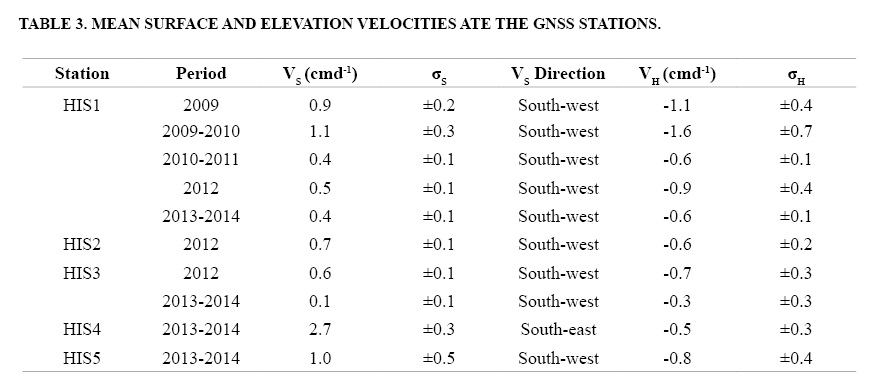 The lowermost portion of the HIG is entering a period of relative inactivity following recent rapid collapse, having recently experienced surface changes over several years (Fig. 6). Similar values of surface velocities were found at HIS1, HIS2 and HIS3 for the 2010-2014 period. The uppermost stations (HIS4 and HIS5), have also shown a major horizontal displacement during the 2013-2014 seasons, which may be related to the influence of an external source such as a rockglacier. Following these changes, velocities in elevation (VH) at the HIS1 site had a large motion rate in the 2009-2012 period, and a thinning increase in 2009-2010 that may be attributed to the low altitude reached by the glacier in 2006 (3,500 m a.s.l.), where the temperatures are above 0 °C, and the ice is prone to melt more quickly. The HIS5 station, in the 2013-2014 season, has the highest rate of elevation change in comparison with the others sites. Elevation changes rates of the GNSS surveys stations at the glacier show a similar variation that may attribute the area chosen for the present study is representative of the HIG.